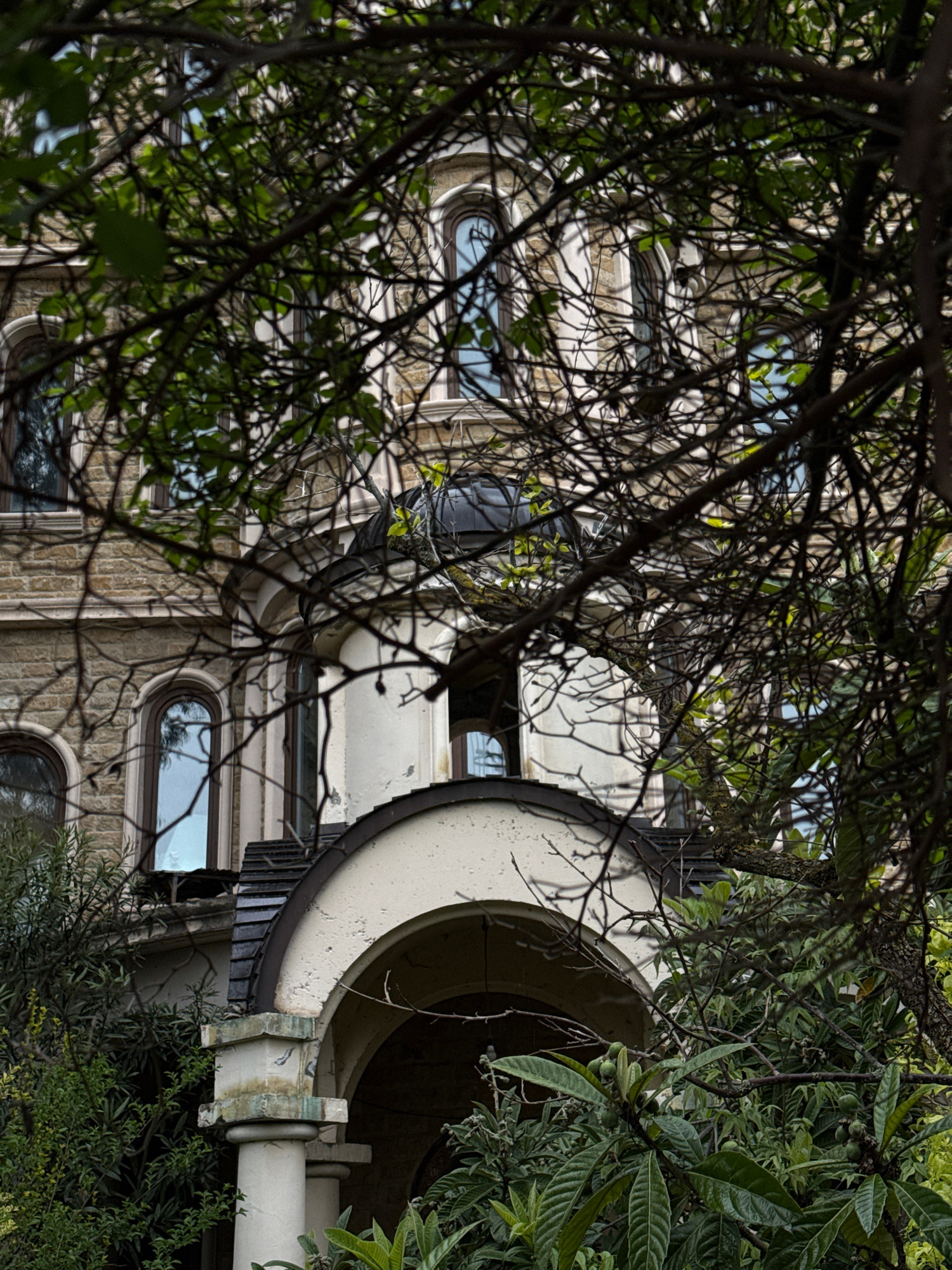 The image depicts a portion of a building with stone cladding and rounded windows, partially obscured by foliage. The architectural style suggests a historical or classical influence. A section of a s…read more