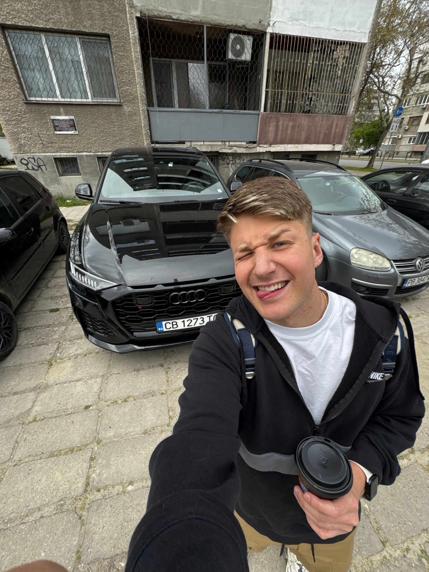 The image captures a man smiling and holding a cup in front of an Audi, parked on a street. The license plate reads "CB 1273 T." Behind the Audi is a grey Volkswagen, parked behind it. The background…read more