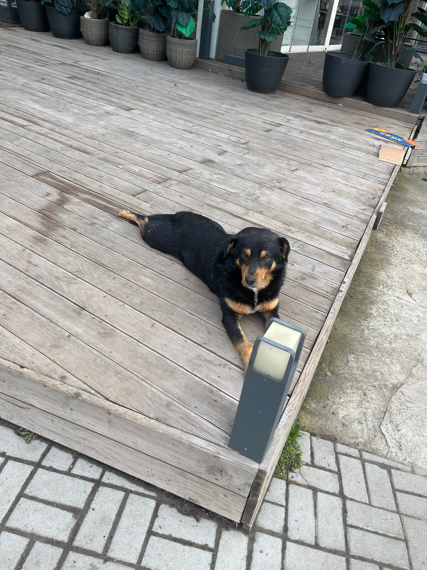 A medium, high-angle shot shows a black and tan dog lying on a weathered wooden deck, next to a dark gray rectangular outdoor lamp. The dog is positioned in the center of the frame, its head near the…read more
