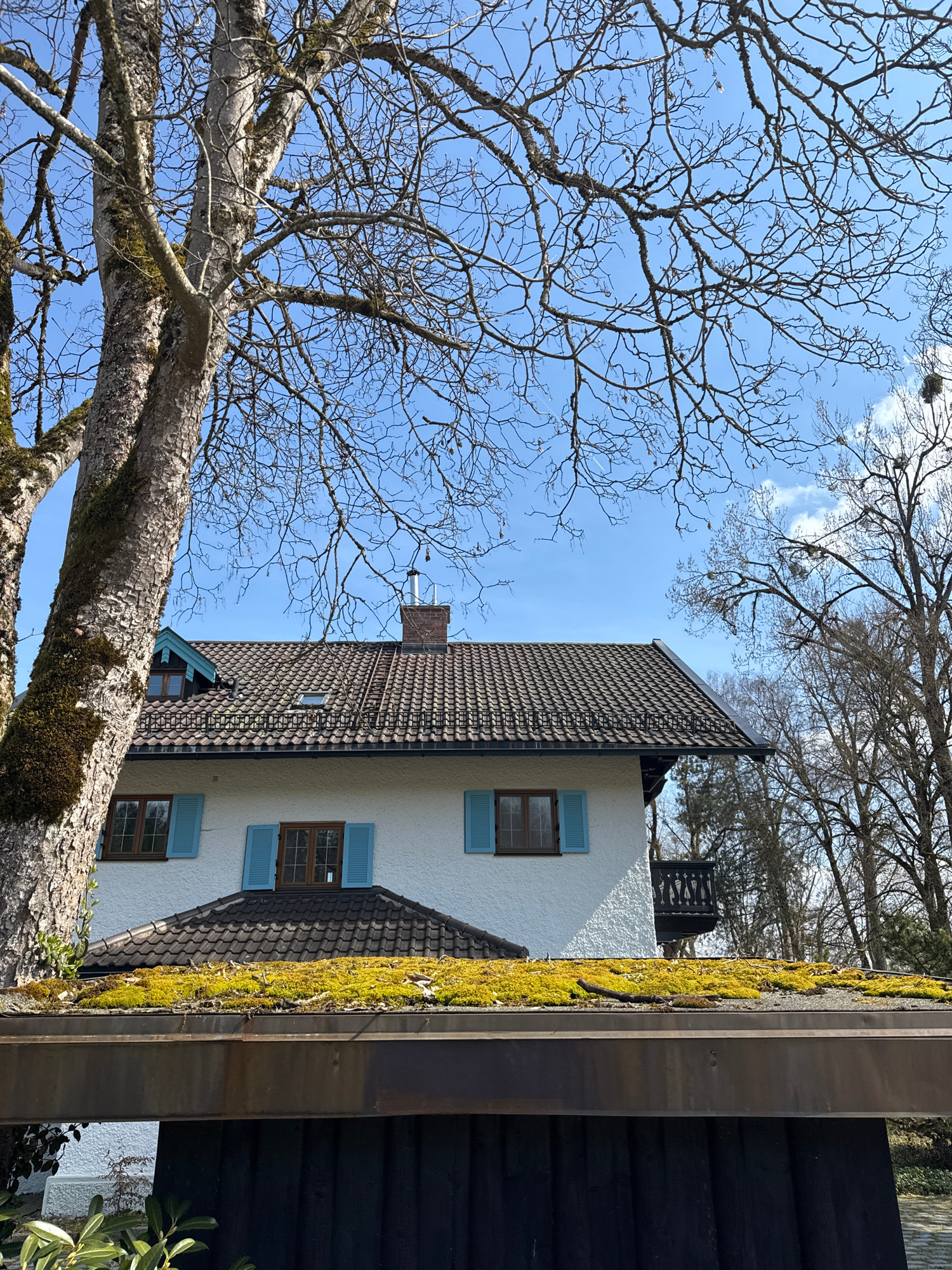 The scene depicts the exterior of a residential property in Rimsting, Germany, observed under a clear blue sky with sparse white clouds. The primary subject is a two-story building featuring a white s…read more