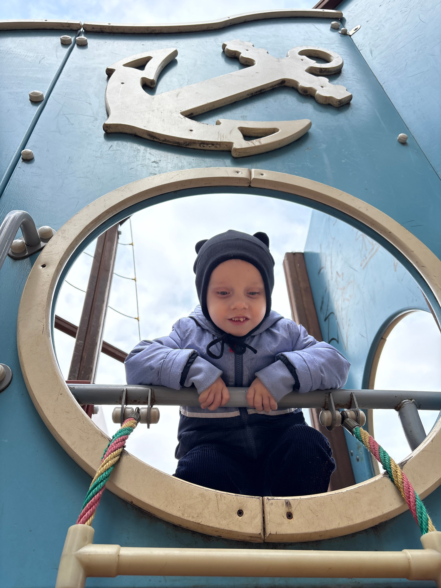 A low-angle, slightly rotated medium shot depicts a young child playing on a playground structure in the city of Chaikovsky, Russia. The child, wearing a blue jacket and a grey hat with small ears, is…read more