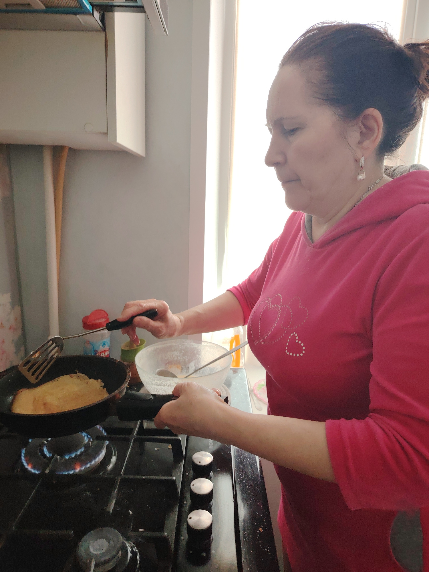In an indoor kitchen setting, a middle-aged woman with dark hair pulled back into a bun stands facing left. She wears a pink hooded sweatshirt adorned with heart designs. The woman is actively engaged…read more