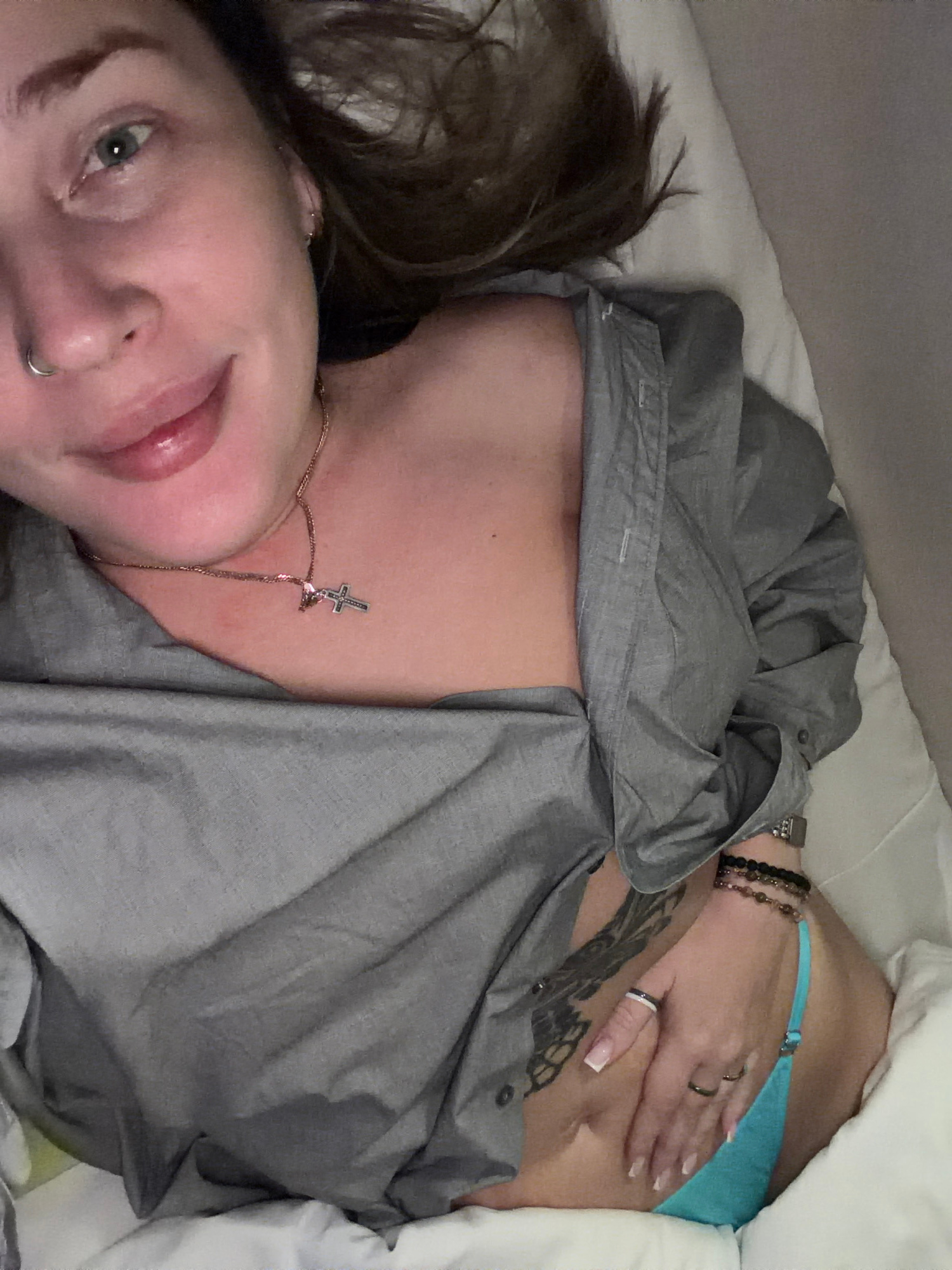 A fair-skinned person with gray-green eyes, visible facial piercings on the nose and ears, and brown hair is lying on a white bed wearing a gray button-down shirt and blue underwear. The person has ta…read more