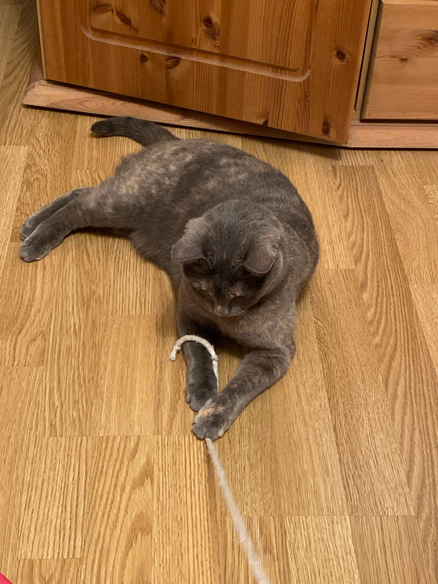 An overhead shot captures a mottled grey-brown cat engaged in play on a light-colored wooden floor. The cat is lying down, facing towards the right, with its head lowered as it focuses intently on a w…read more