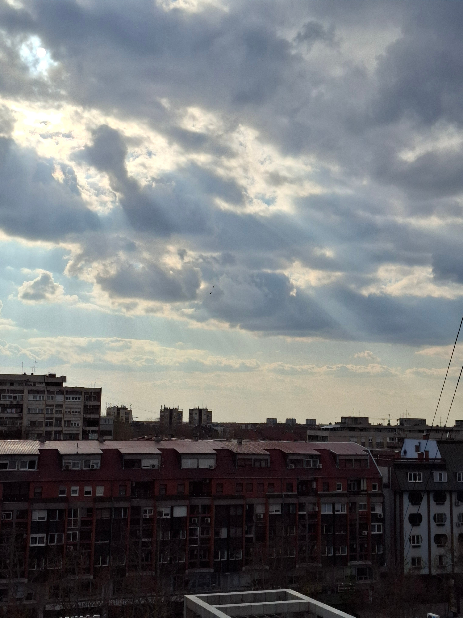 The image depicts an urban landscape in Novi Sad, Serbia. The foreground shows a cloudy sky with visible sunbeams. The background features residential buildings of varying heights and architectural st…read more