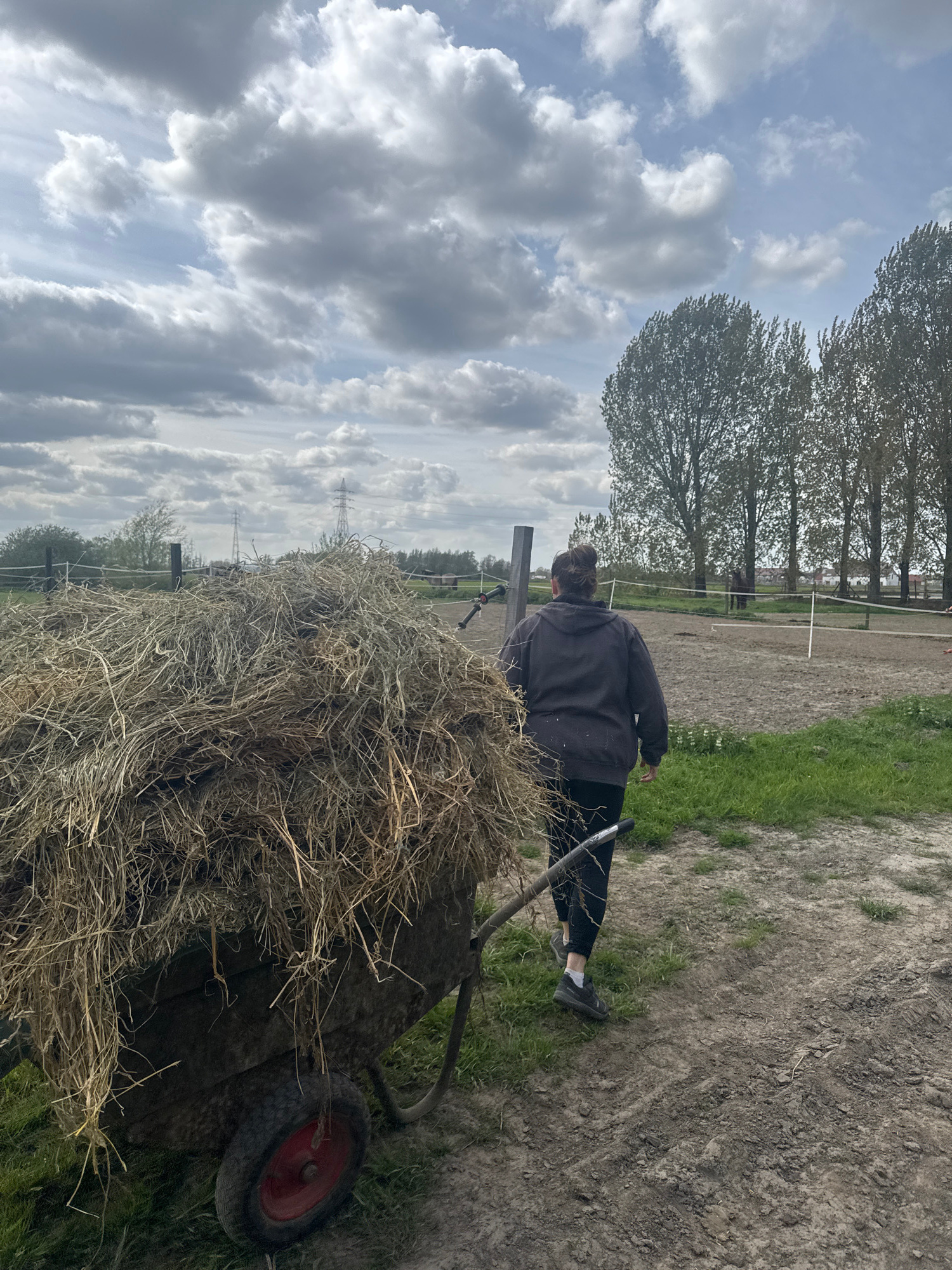 A person is near a full wheelbarrow of hay in a field. The wheelbarrow has a red wheel. The sky is cloudy, and trees and grass surround the field. The location is Estaimpuis, Belgium.