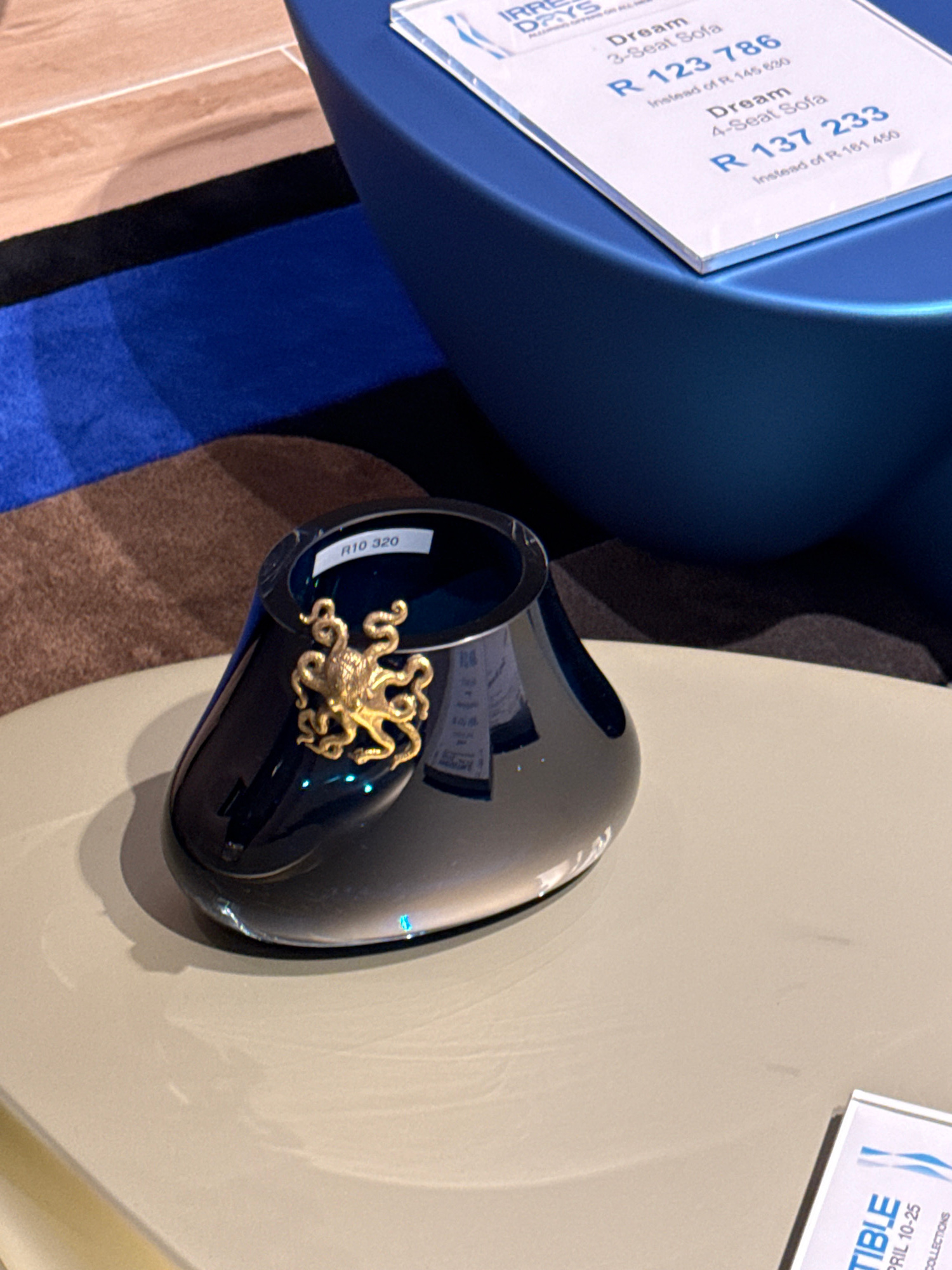 The image shows a dark blue, modern vase with a gold octopus embellishment on its side. The vase sits on a light beige surface. A sign displaying "R10 320" is visible on the interior of the vase. To t…read more