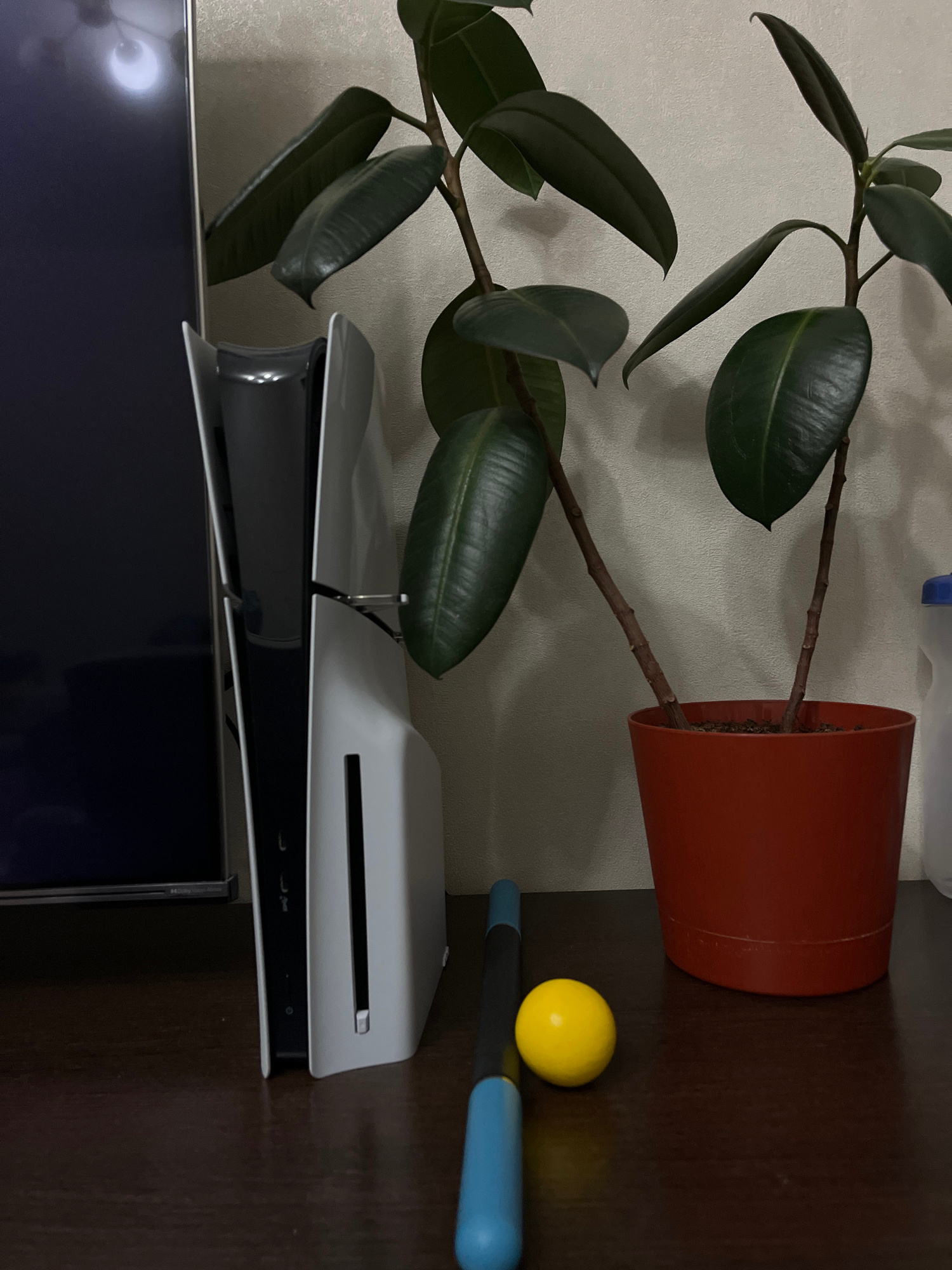 A ficus plant in a terracotta pot is located on a dark brown wooden surface next to a white PlayStation 5 console. Adjacent to the console is a yellow ball and a blue and black object. The corner of a…read more
