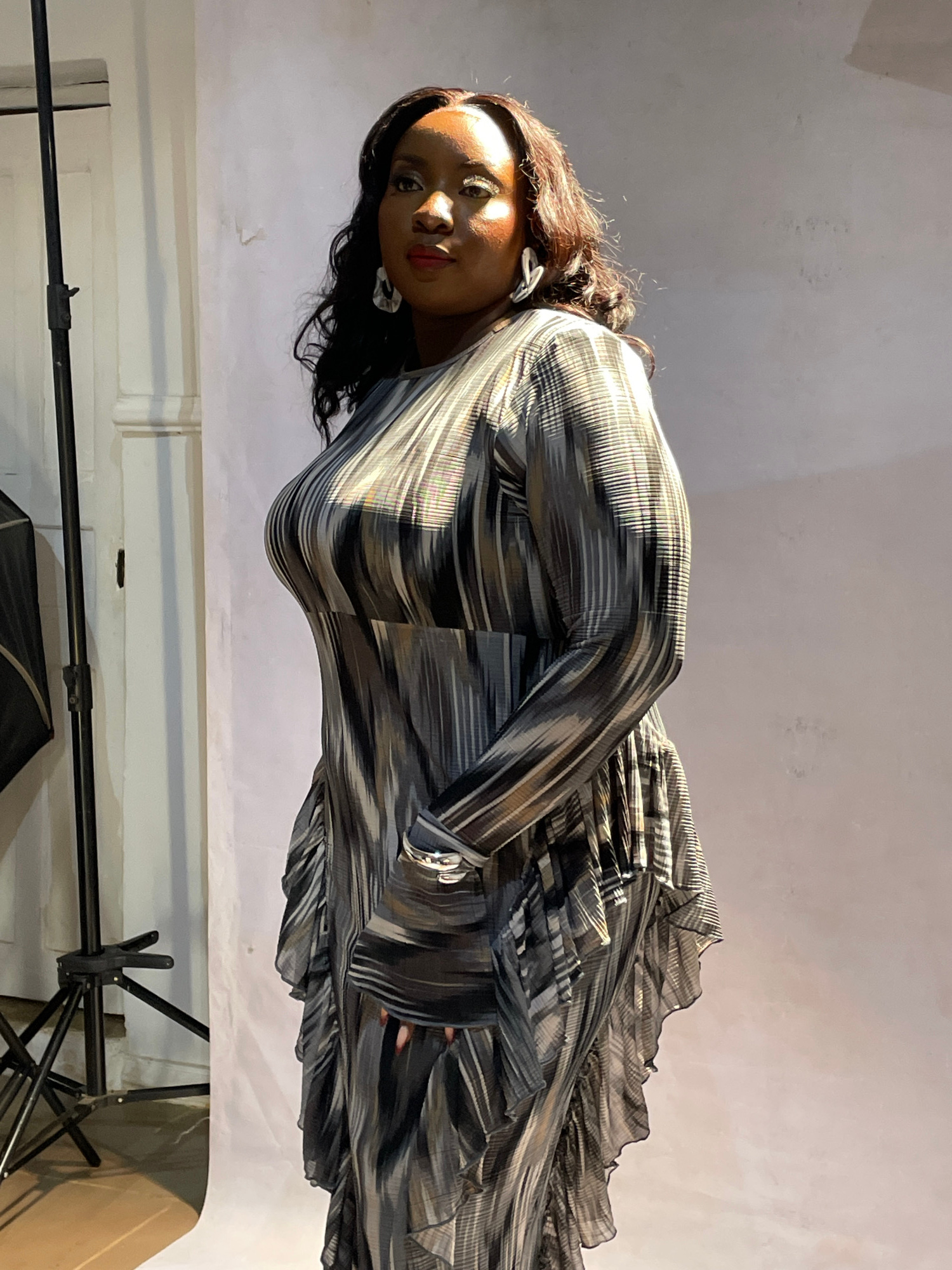 A woman with dark skin and long, dark hair is captured in a full-body shot, posing for a photograph. She looks slightly off-camera with a composed expression, wearing red lipstick and large, light-col…read more