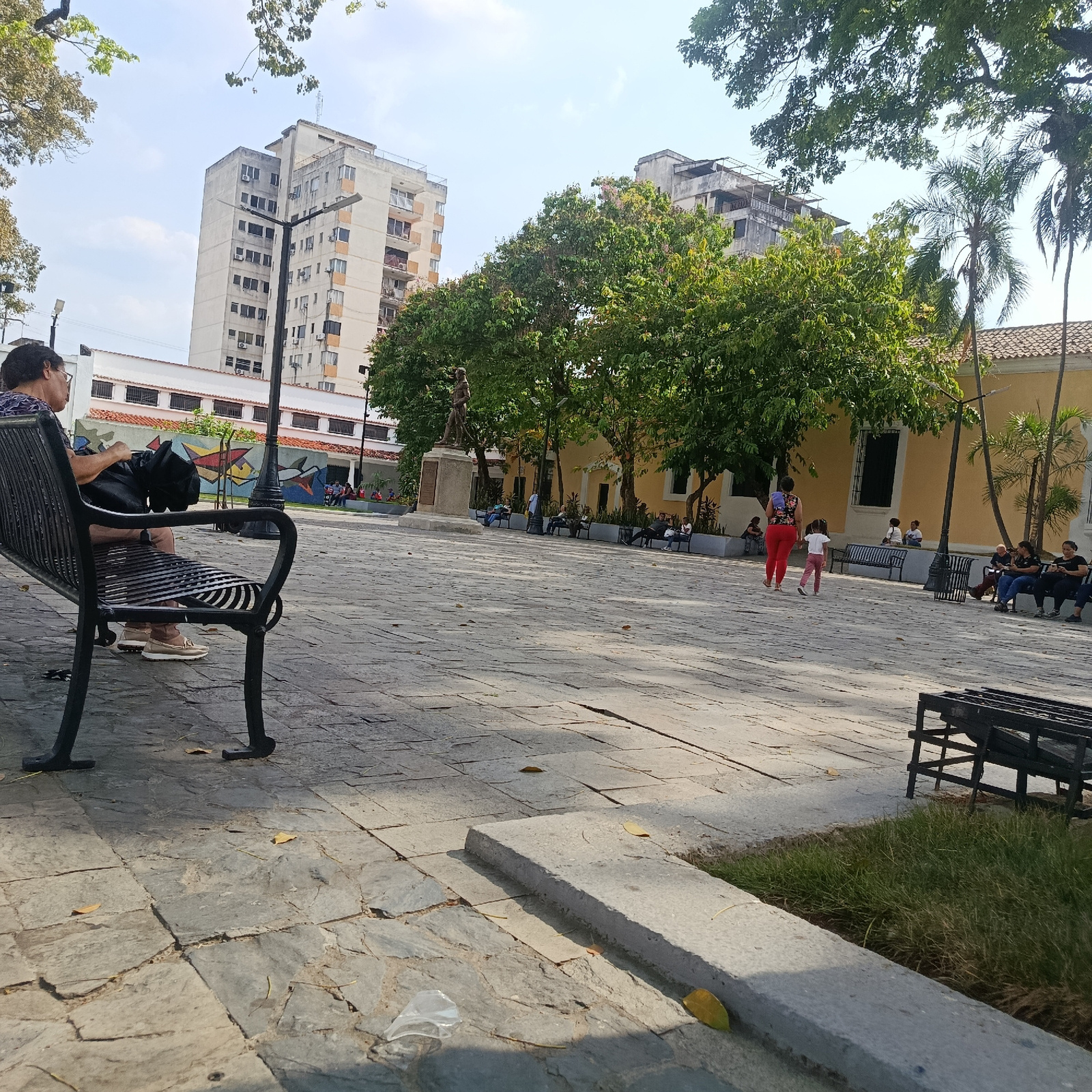 The image captures a scene in a public square in Valencia, Venezuela. The ground is paved with large stone tiles. A woman sits on a black metal bench in the foreground. Behind her, people are seated o…read more