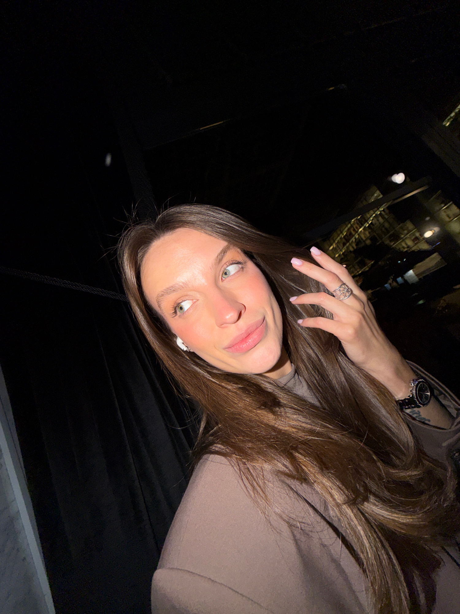 A selfie of a woman with light skin and green eyes, facing the camera at an upward angle. She has long brown hair. The woman wears a beige jacket. She has a ring on one hand and a watch on the other.…read more