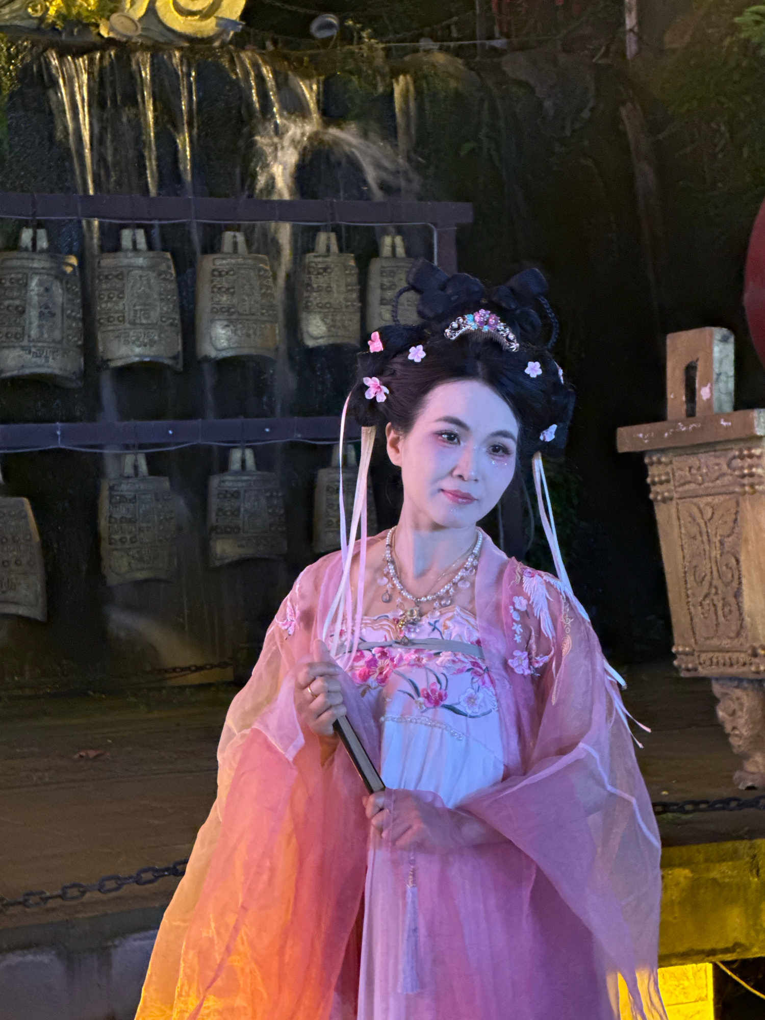 A low-angle, medium shot shows a person wearing a pink traditional Chinese hanfu, standing near a waterfall in Yuzhong District, Chongqing, China. The person has black hair styled in an updo with flor…read more
