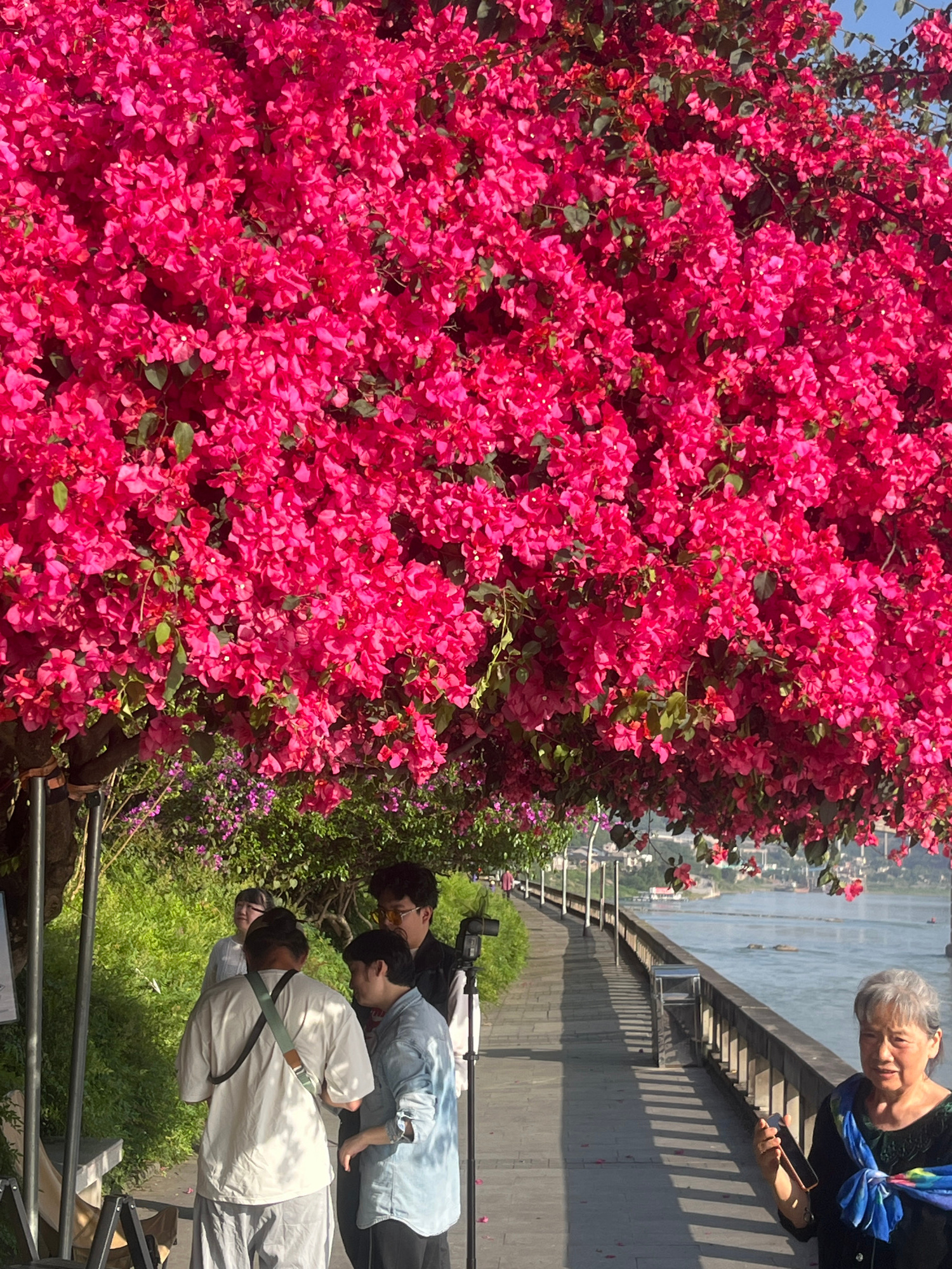 This image captures a vibrant riverside scene in Jiangjin, China, featuring an abundance of bright pink bougainvillea flowers, several individuals, and a wide river. The left side of the frame is dom…read more