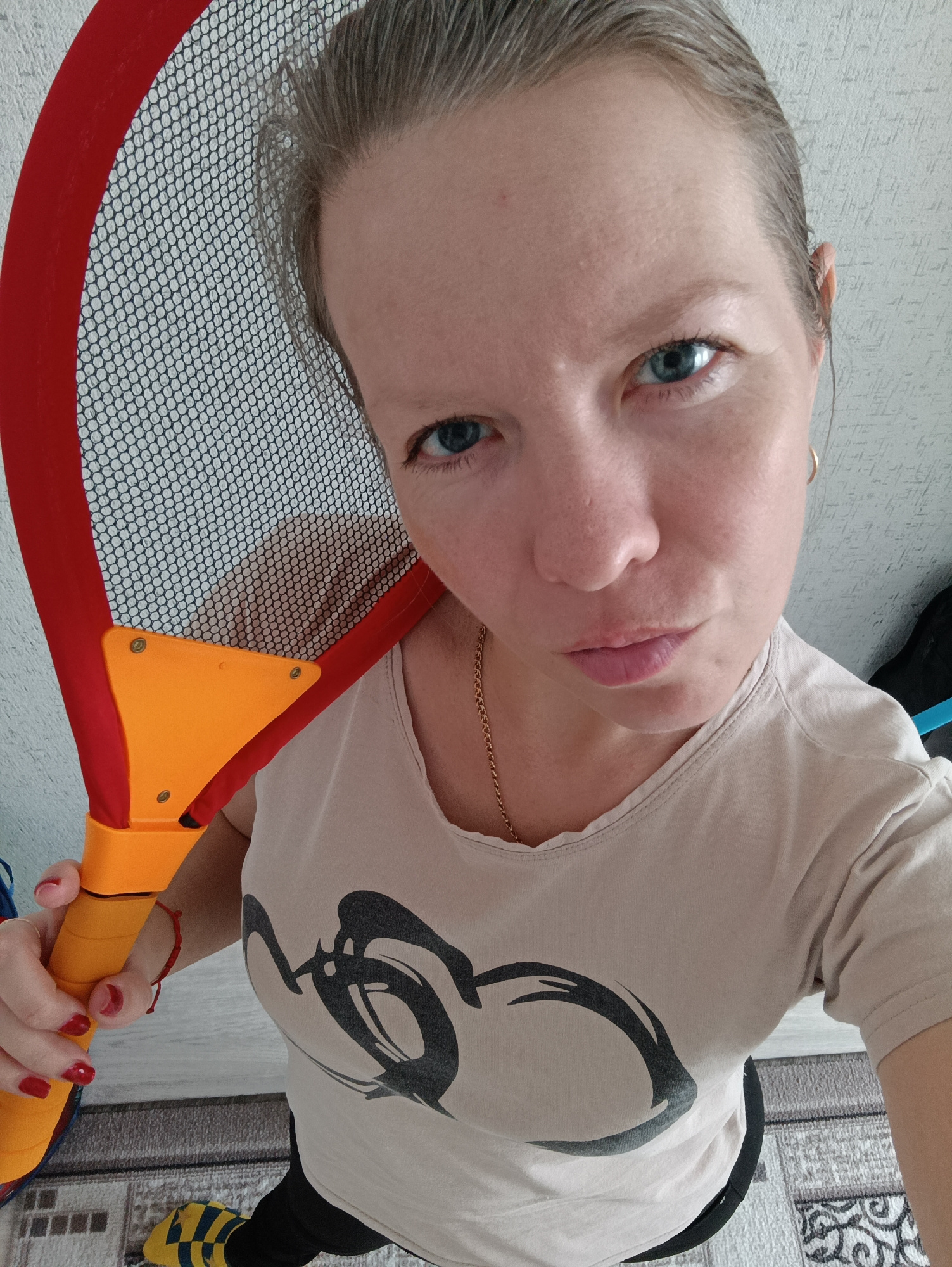 A woman is holding a badminton racket in a room with wallpapered walls. She has fair skin, blue eyes, and her hair is pulled back. She's wearing a beige t-shirt with a black design, a gold necklace, a…read more
