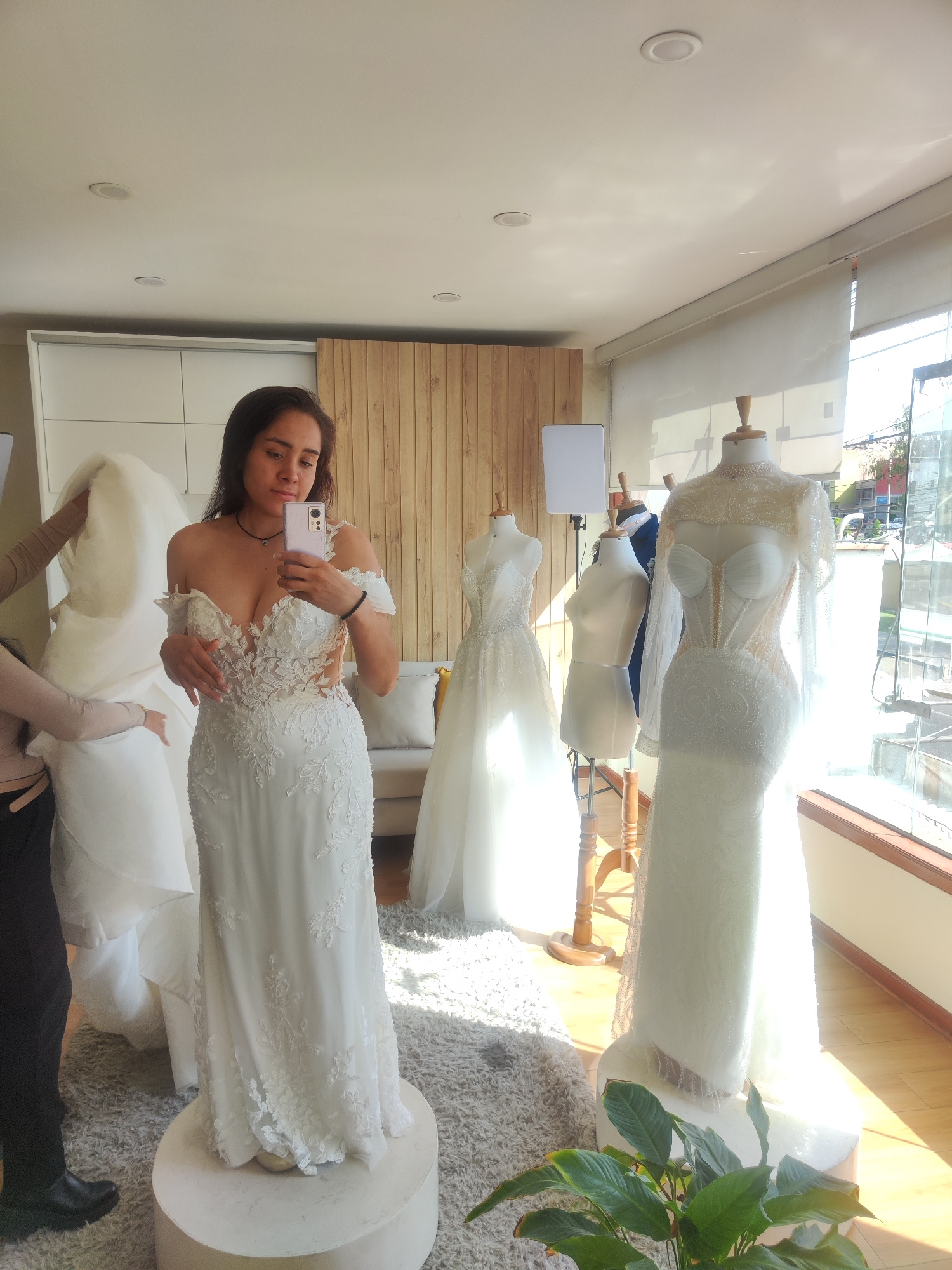 A woman in a white wedding dress stands on a platform in a bridal shop, taking a selfie with her smartphone. Another person is partially visible to the left, holding a large piece of fabric. The shop…read more