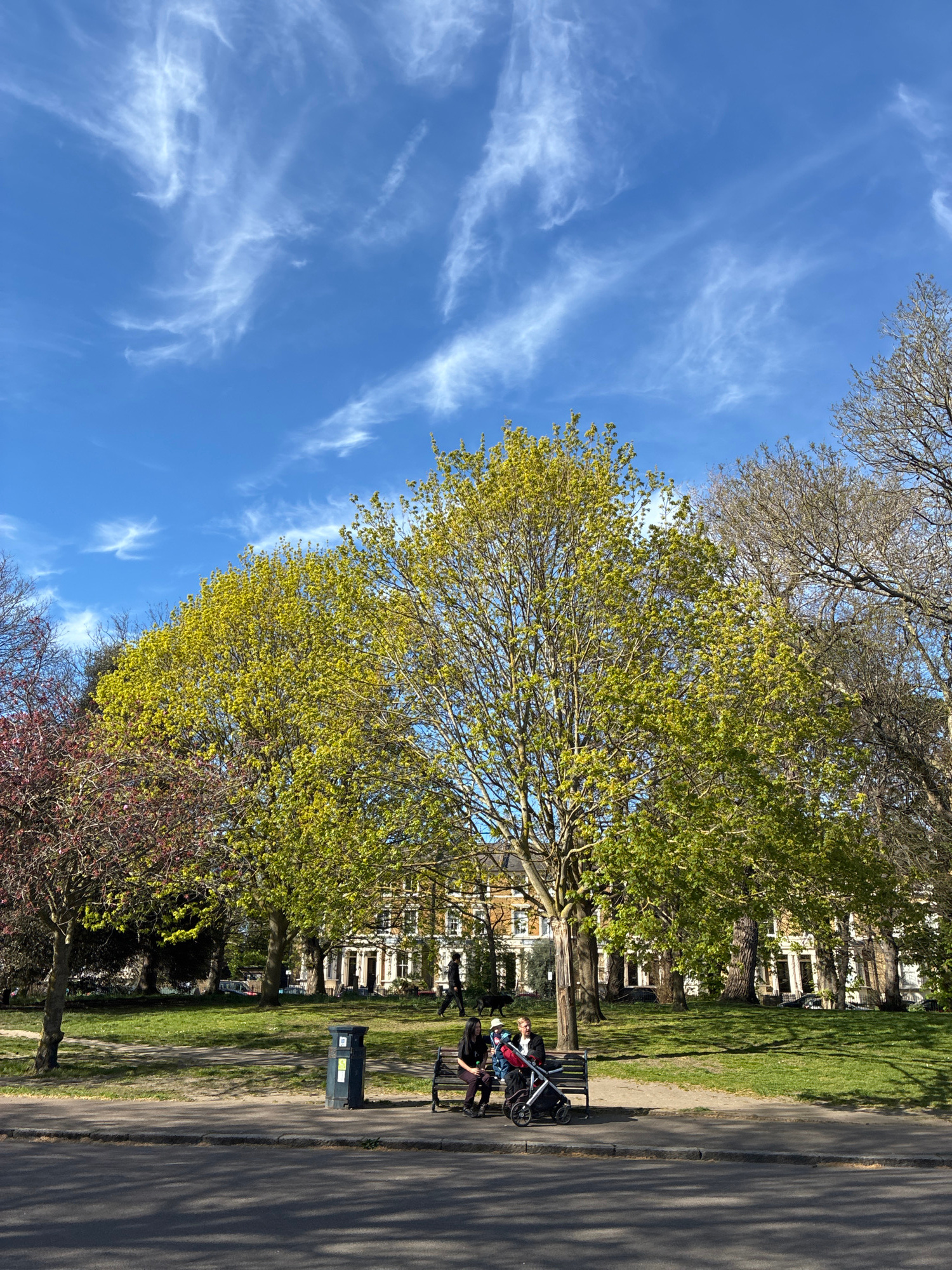 The image shows a park in London, United Kingdom. A clear blue sky with cirrus clouds forms the backdrop, contrasted by trees with green foliage. A paved pathway runs alongside a grassy area dotted wi…read more