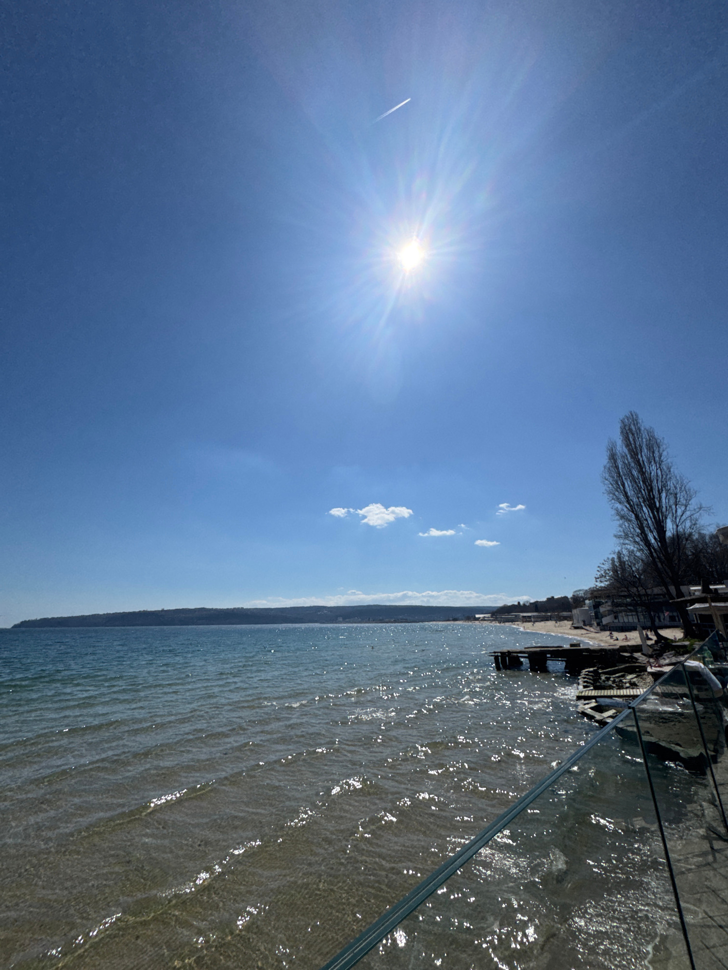 The image depicts a sunlit scene in Varna, Bulgaria. It showcases the Black Sea and a portion of the coastal area. The blue sky occupies a significant portion of the image, with the sun emitting stron…read more