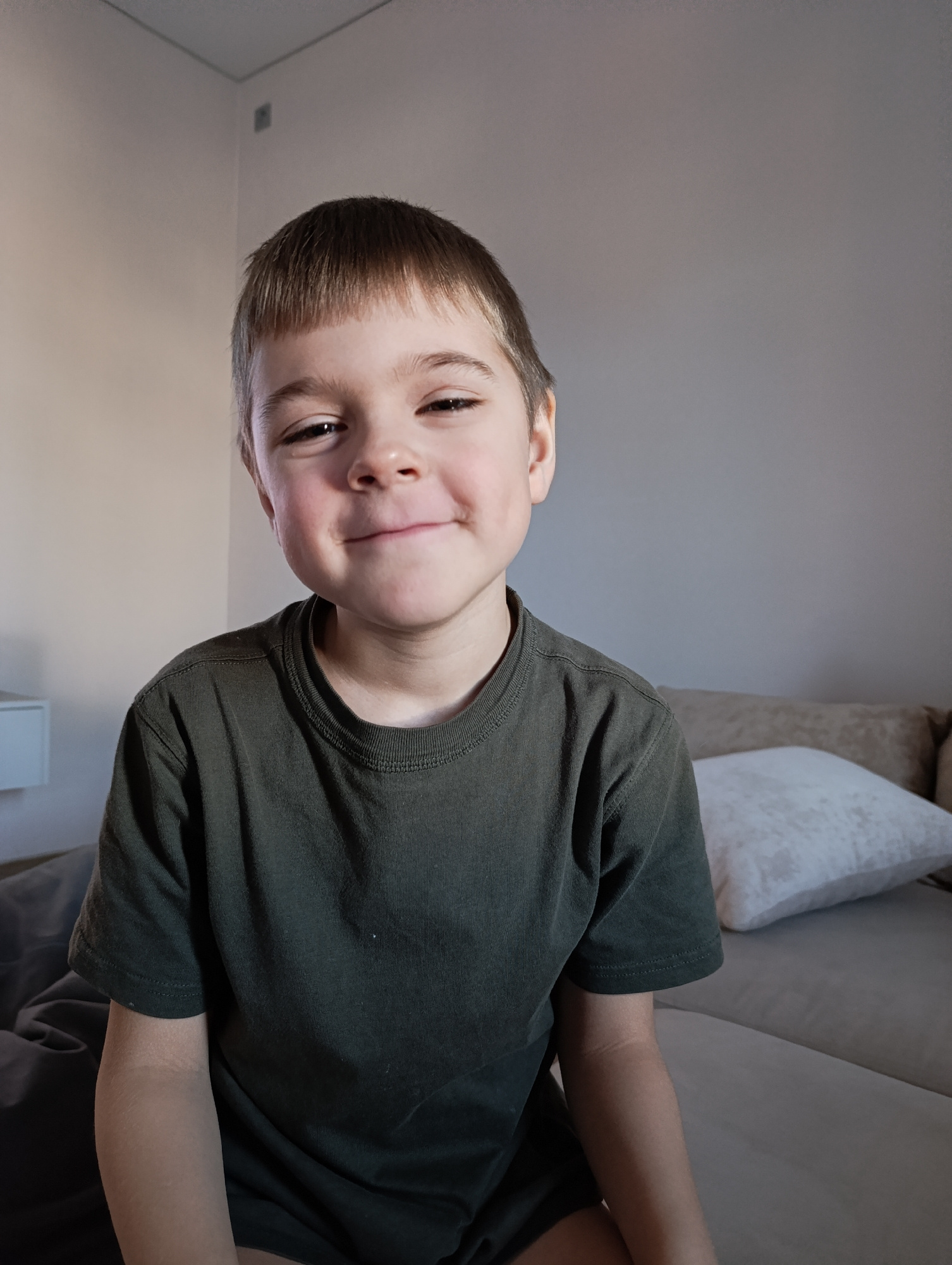 A young boy with fair skin, short brown hair, and bangs is captured in a head-and-shoulders portrait, looking directly at the camera with a gentle, closed-lip smile. His dark eyes are open, and faintβ¦read more