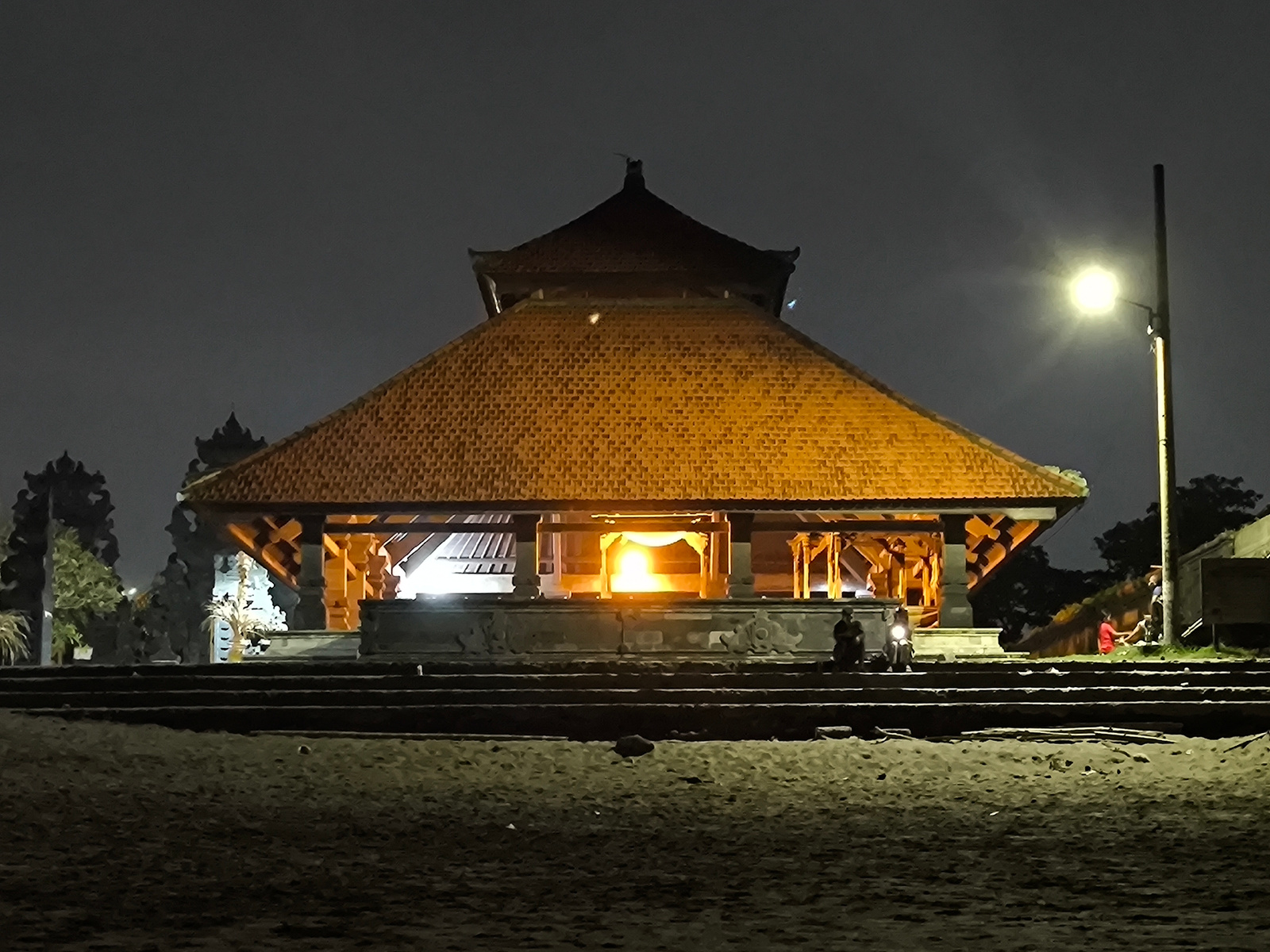 At night in Canggu, Indonesia, a large Balinese temple structure with a multi-tiered tiled roof is illuminated. The structure is set back from the viewer and sits atop a series of stairs. A bright lig…read more