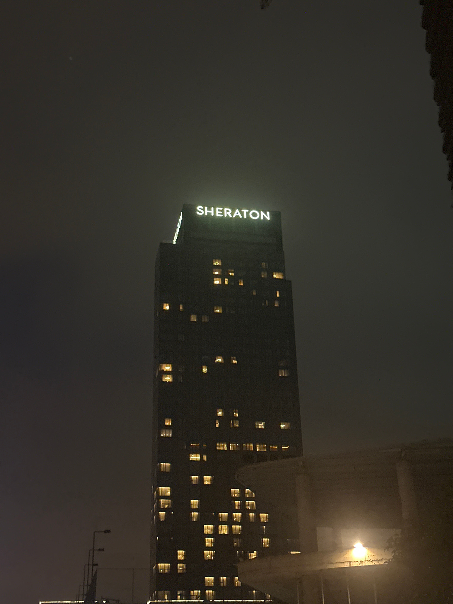 The image, when correctly oriented, depicts a tall, dark building at night, likely a hotel, situated in an urban setting. The building's facade is characterized by numerous rectangular windows, many oβ¦read more