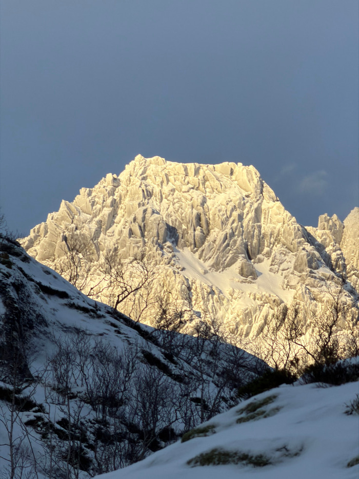 The image displays a rugged, snow-covered mountain landscape located near Laupstad, Norway. A prominent mountain peak, characterized by sharply defined, angular rock formations heavily layered with sn…read more