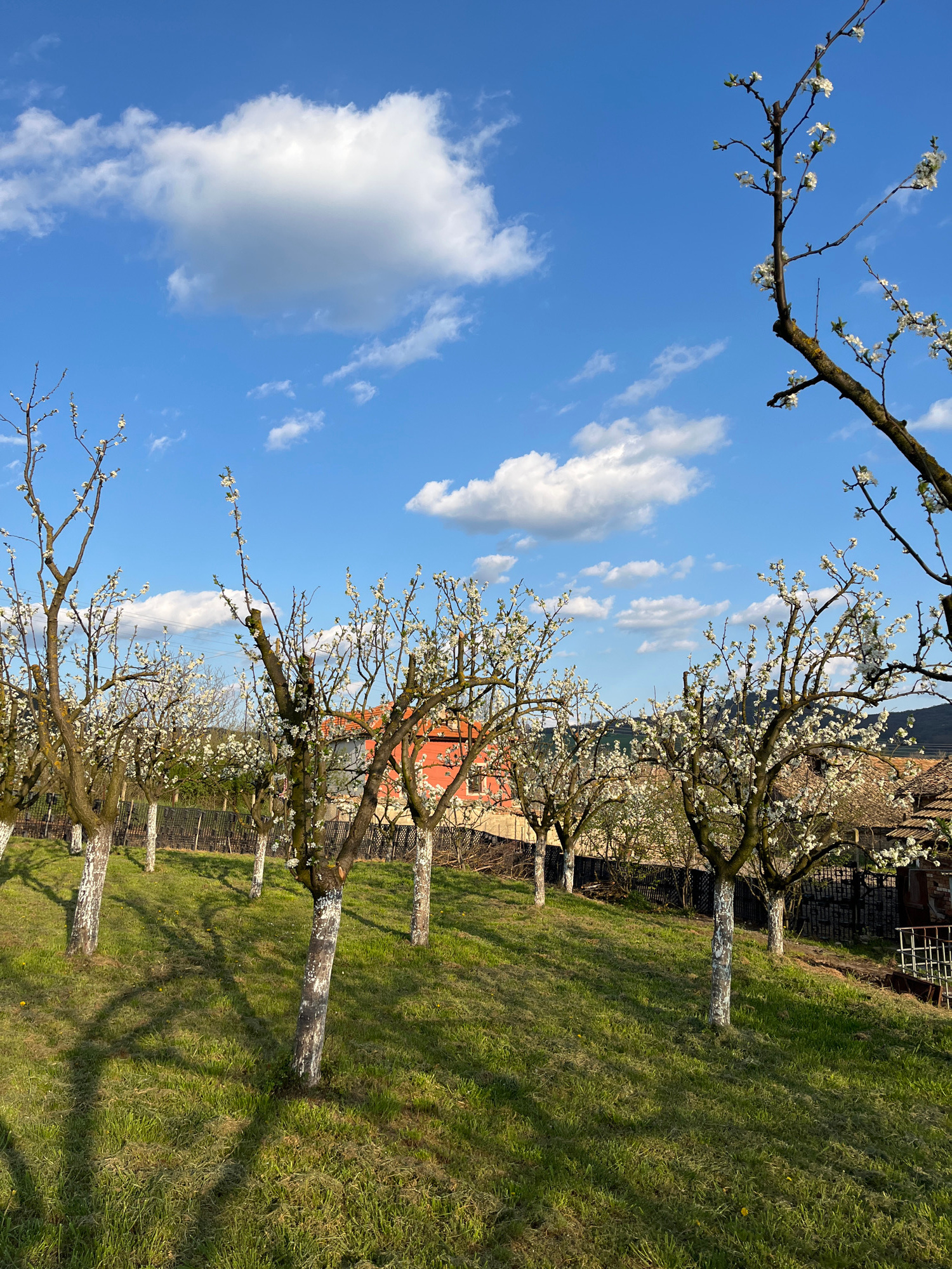 The image depicts a scene in Drinovo, Bulgaria. A row of blooming trees with white flowers lines a grassy area under a bright blue sky with scattered white clouds. The tree trunks are partially painteβ¦read more