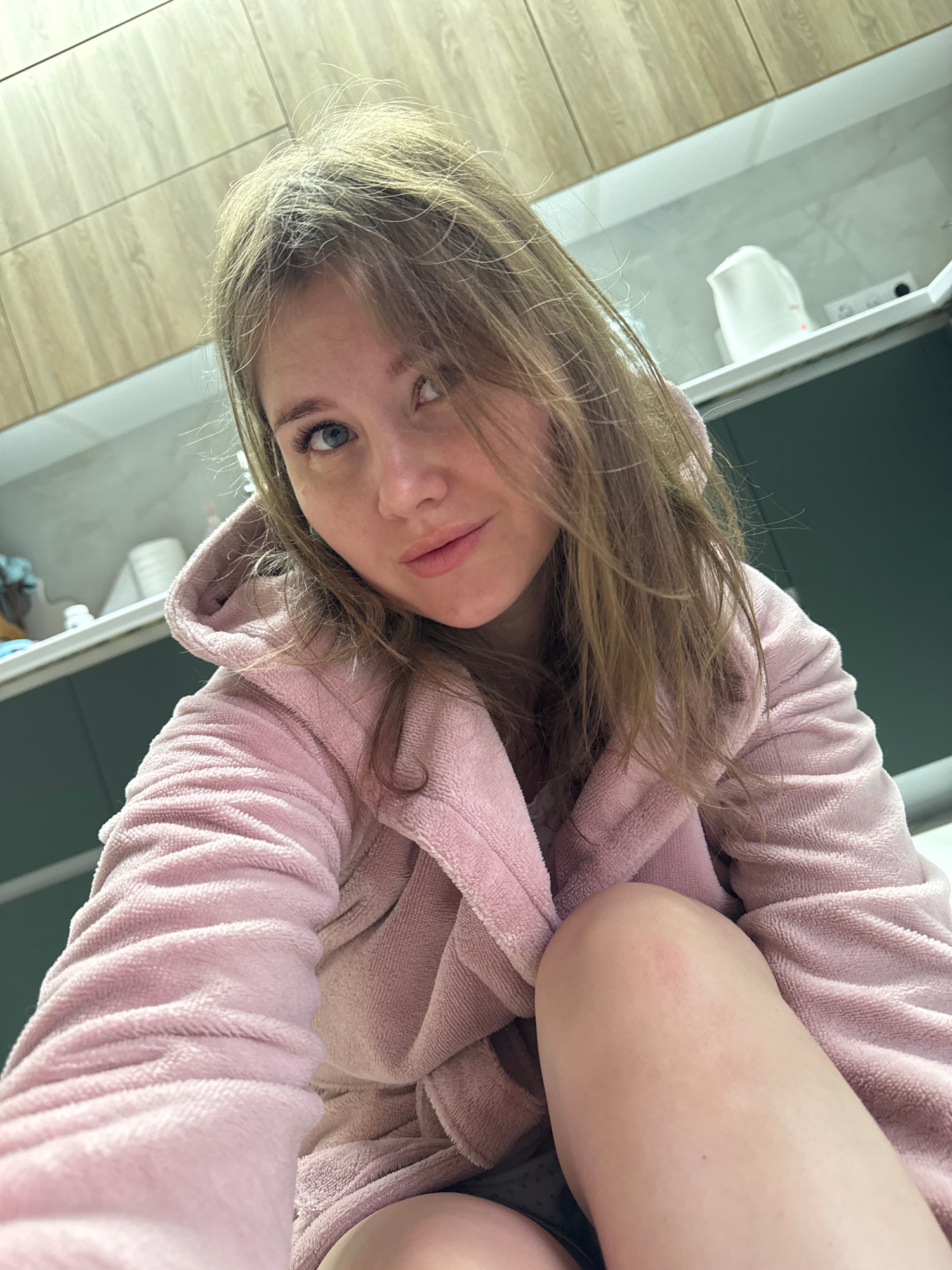 A selfie photograph shows a young woman wearing a pink hooded robe. She is positioned at an angle, looking towards the camera with a neutral expression. Her hair is light brown. The background appears…read more