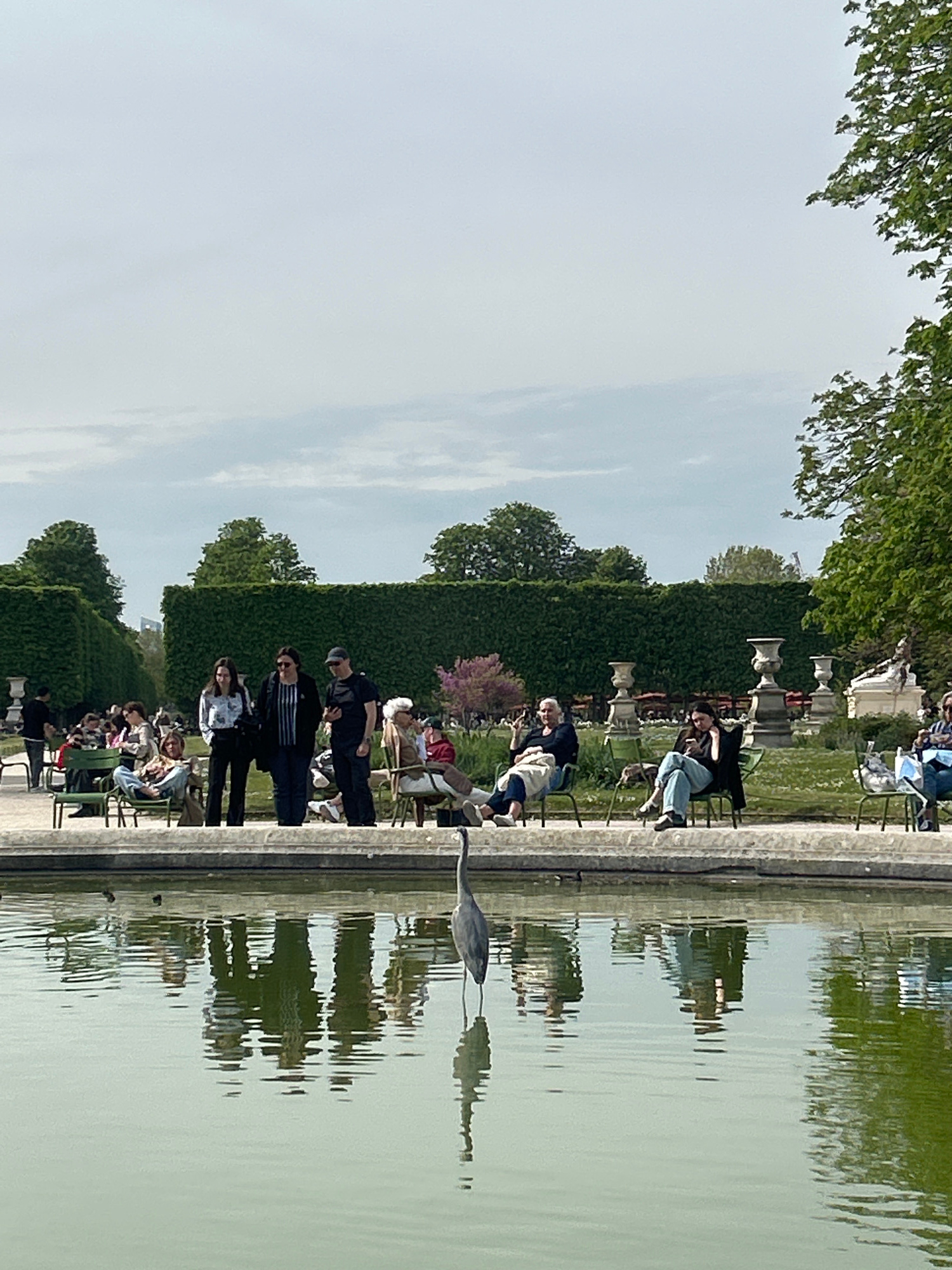 The image shows a park with a body of water in the foreground and people sitting in chairs along the water's edge. A bird, possibly a heron or egret, stands near the edge of the water. The water refle…read more