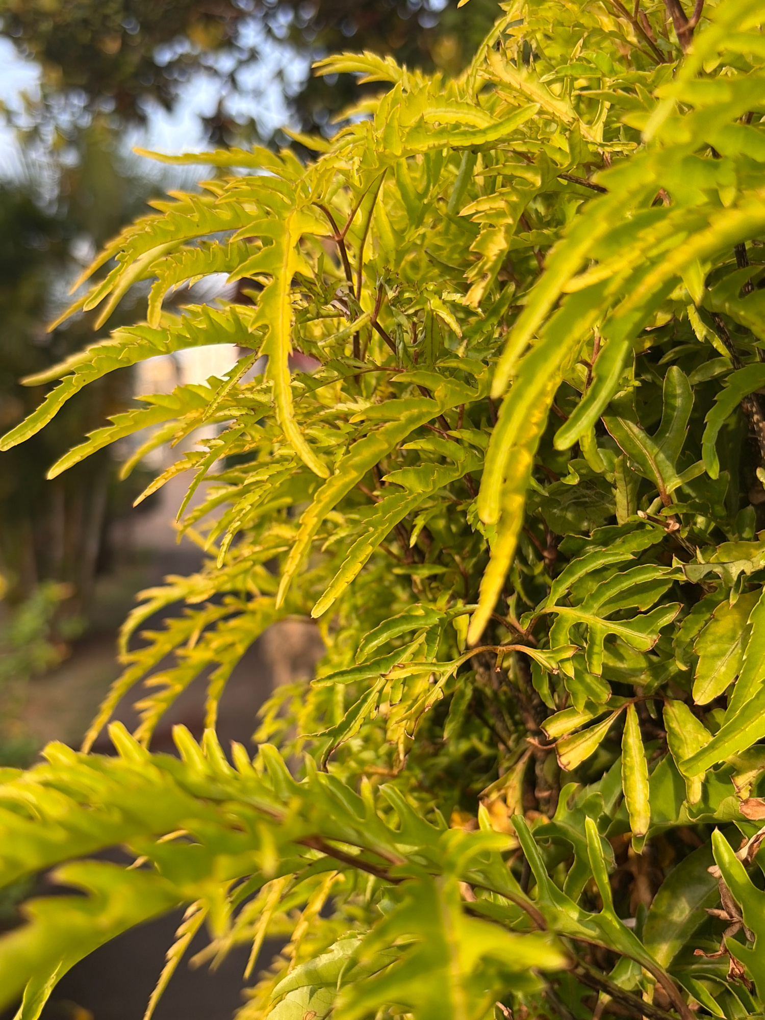 The image features a close-up view of a fern plant, likely in Guayana City, Venezuela, based on the prompt. The fern has light green, serrated leaves. Some brown stems are visible amidst the foliage.…read more