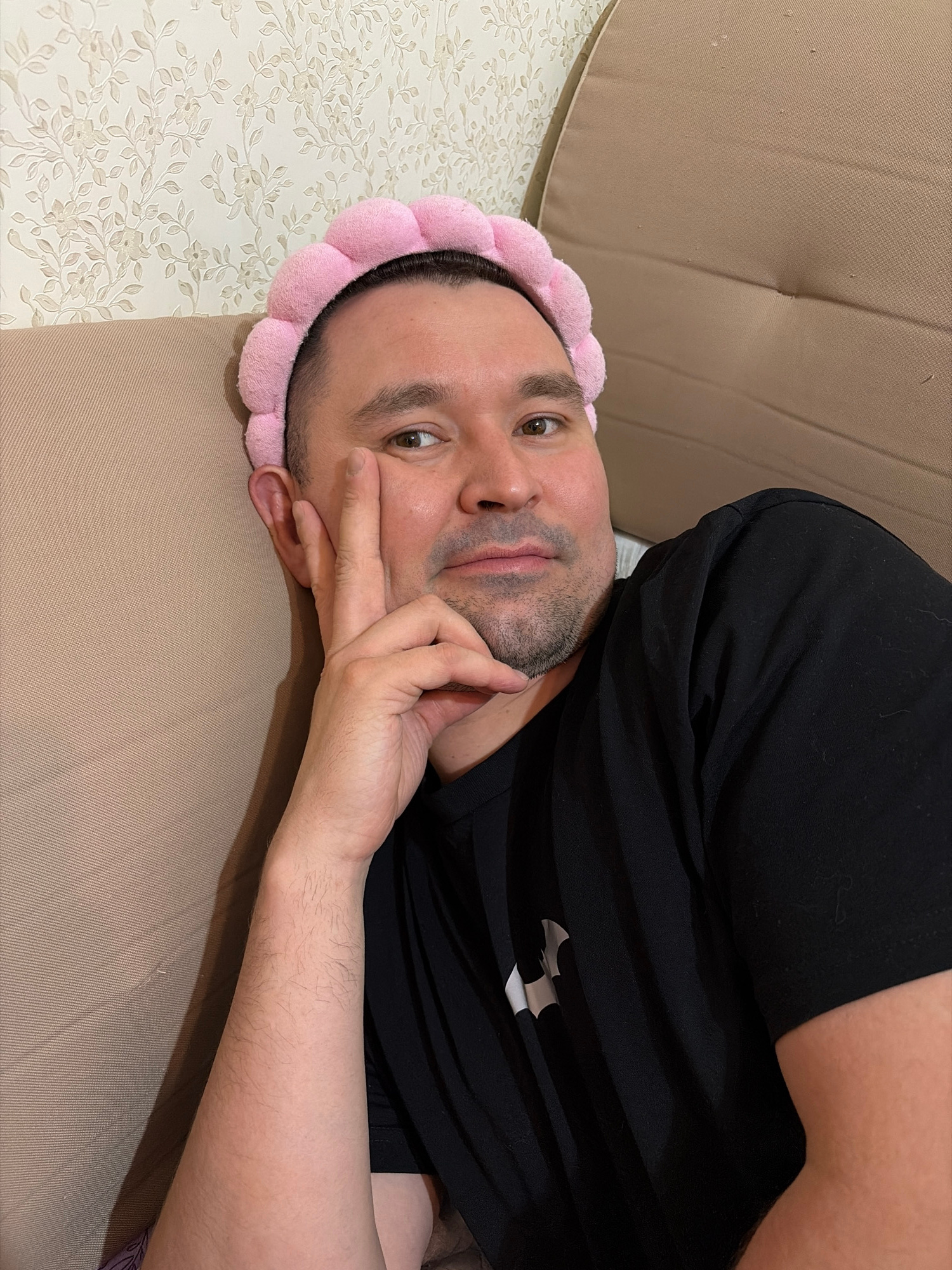 A man is lying on a light brown couch with a patterned wallpaper behind him. He is wearing a black shirt and a pink headband. His left hand is supporting his face, and he is looking at the camera. I a…read more