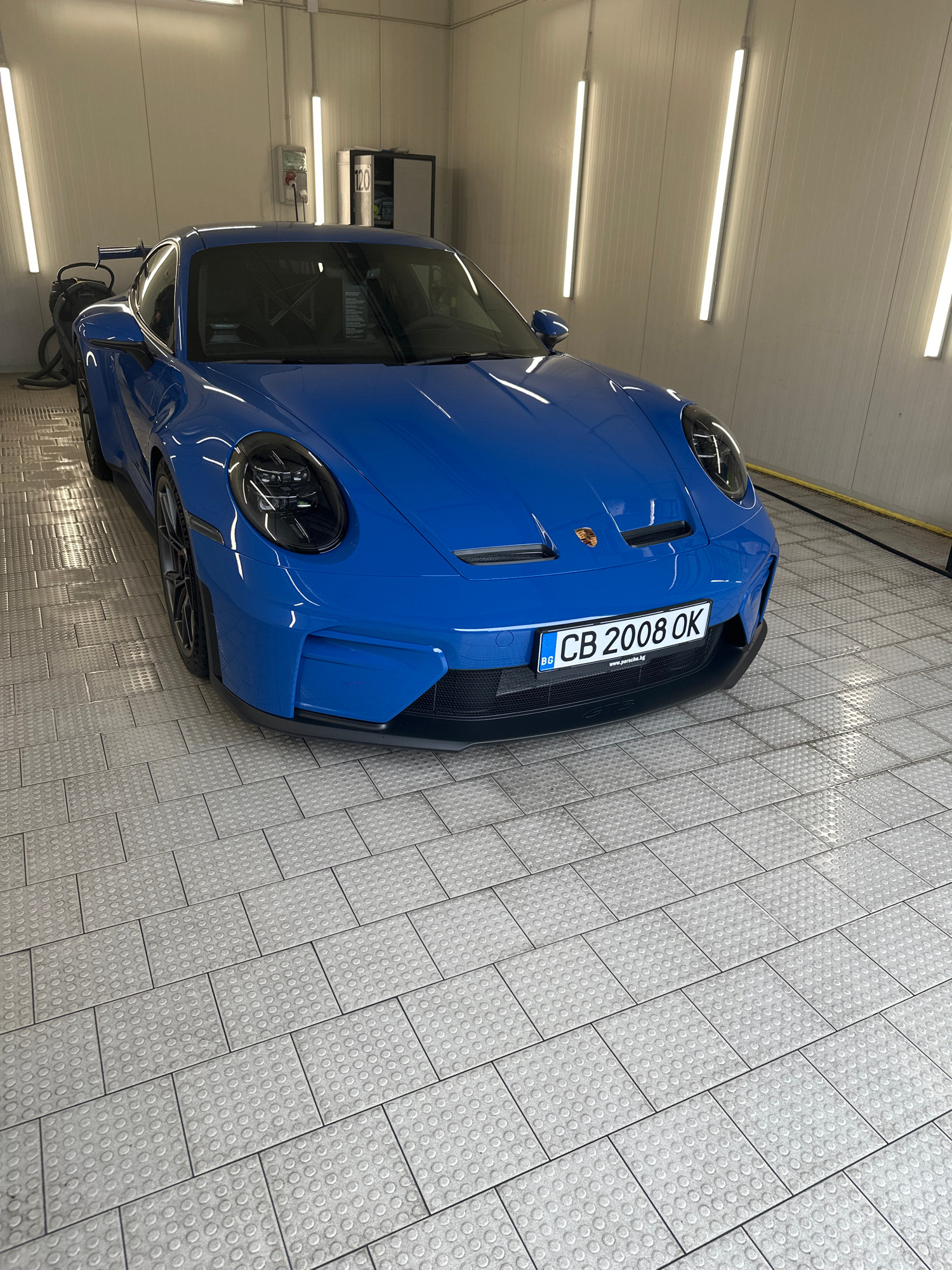 A blue Porsche 911, license plate CB 2008 OK, is parked inside a brightly lit garage or detailing shop. The floor is composed of patterned grey tiles. The walls and ceiling are white with long fluores…read more