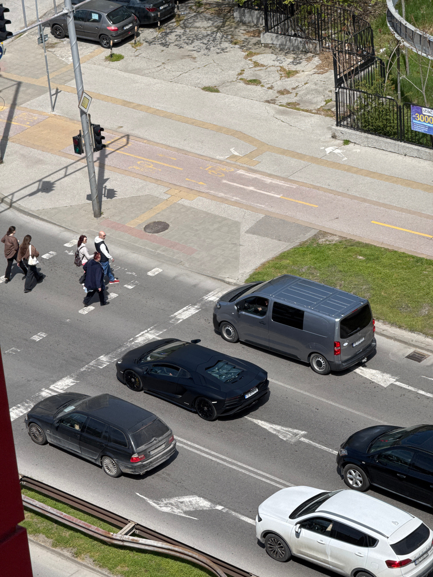 This high-angle image captures a bustling street scene in Plovdiv, Bulgaria, under bright, sunny daylight. The perspective looks down onto a multi-lane road, sidewalks, and a grassy strip, showing veh…read more