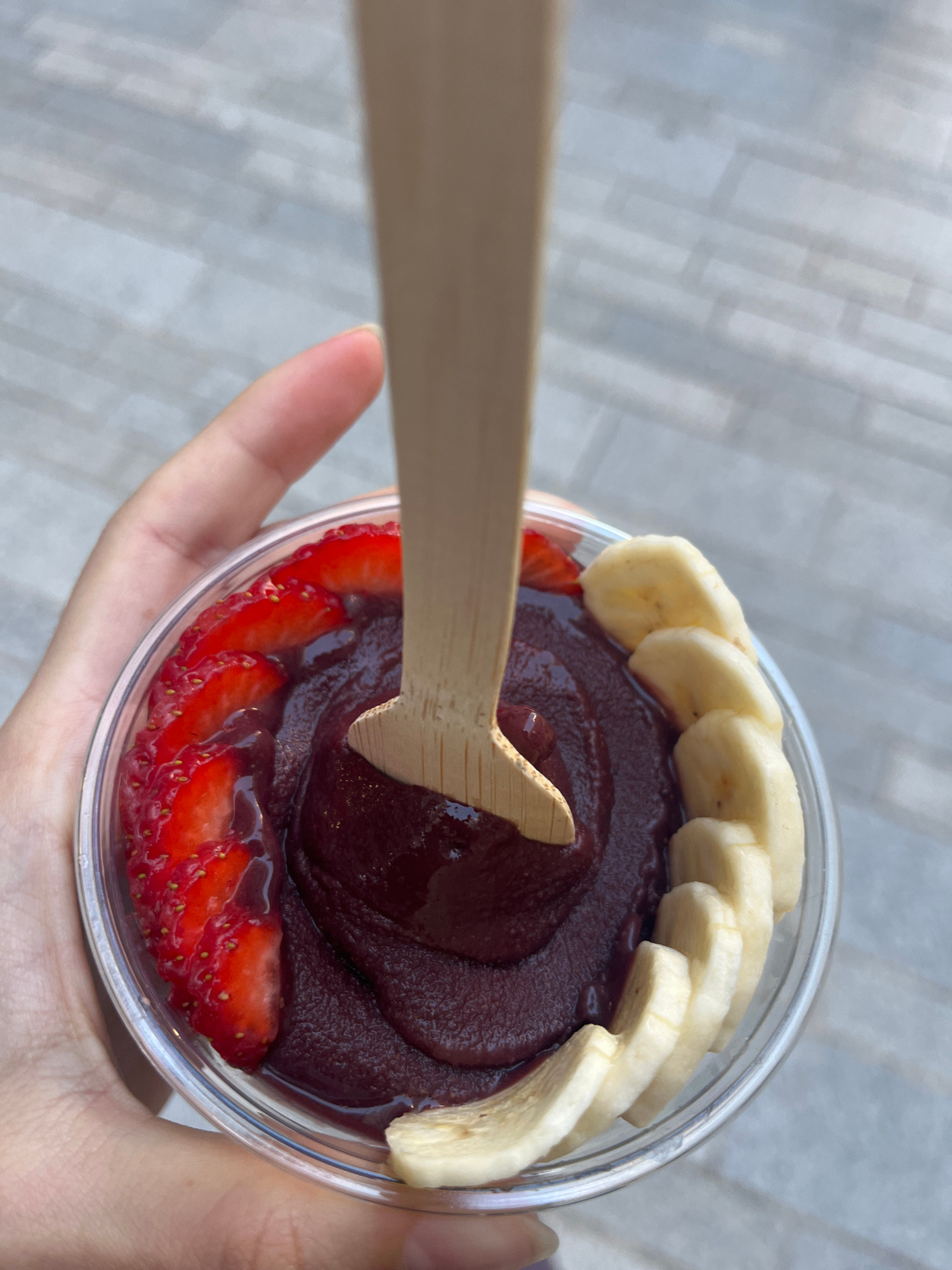 The image depicts a person holding a clear plastic bowl filled with an acai bowl. The bowl contains a thick, dark purple acai base, topped with sliced bananas arranged along one edge and sliced strawb…read more