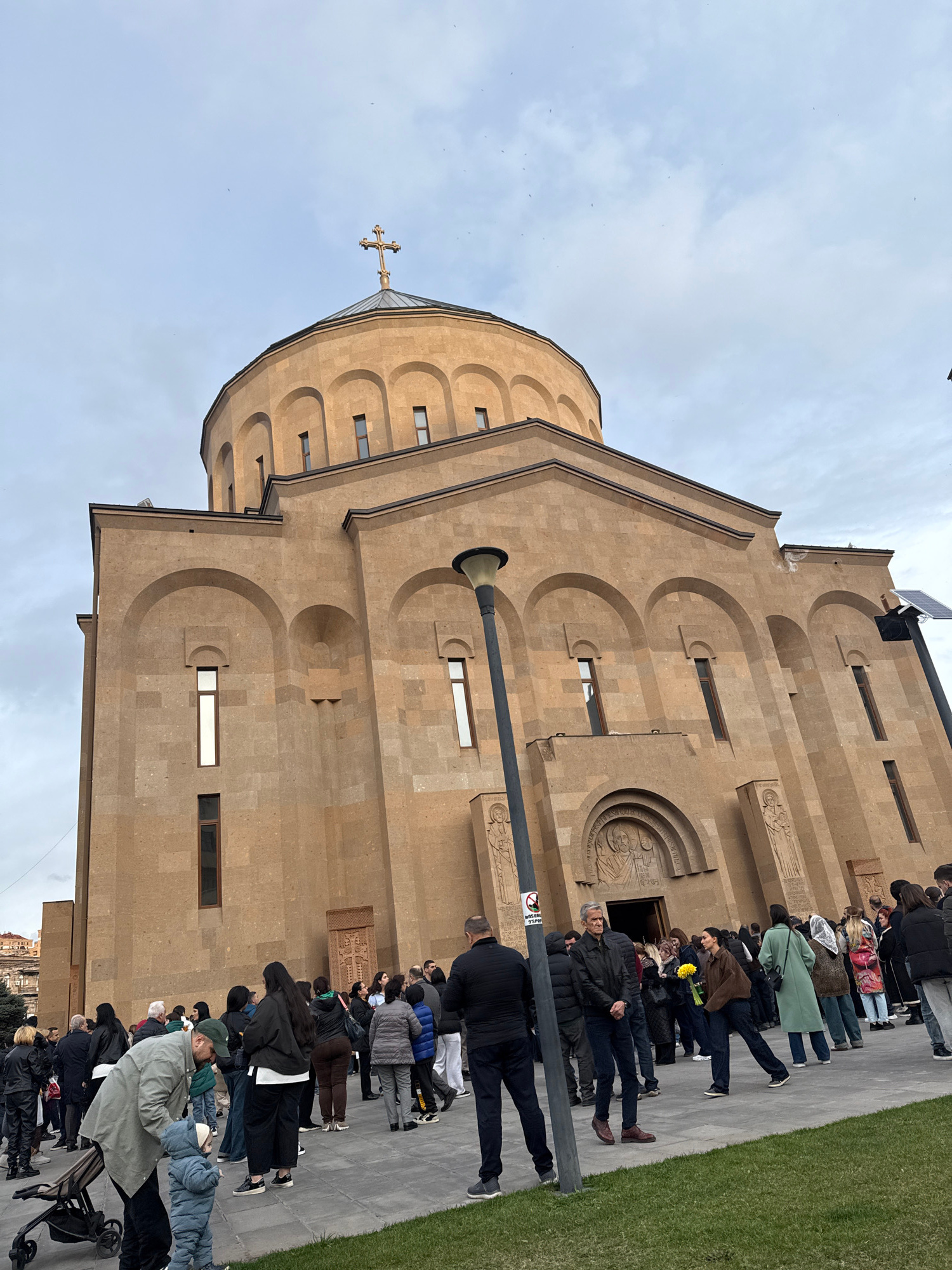 The image shows Saint Anna Church in Yerevan, Armenia. A crowd of people is gathered outside the church. The church is a light brown stone building with a dome topped by a cross. The sky is overcast.…read more