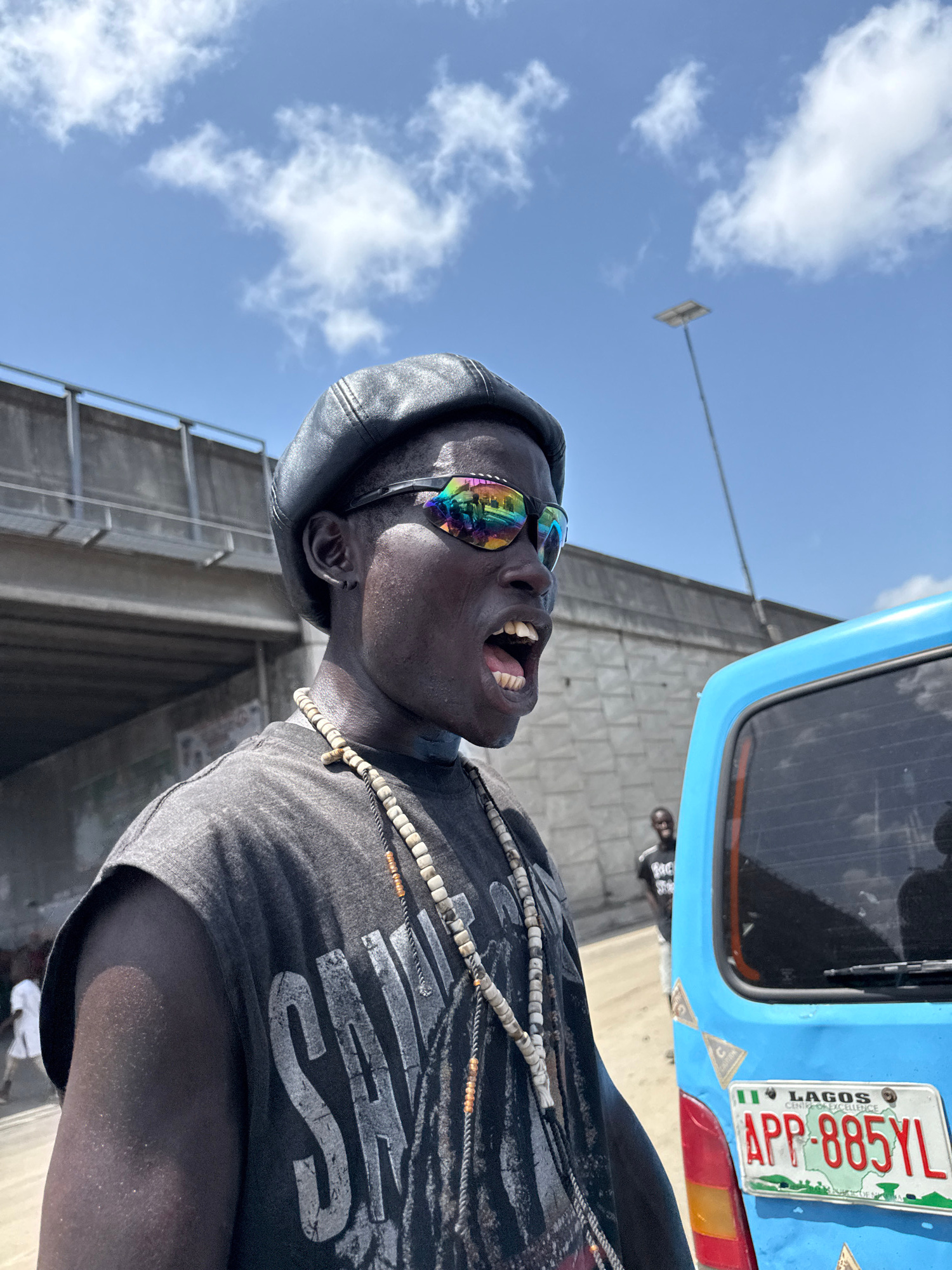 A man wearing a black leather cap, iridescent sunglasses, and a beaded necklace is looking upward with his mouth open. He is wearing a grey t-shirt with a faded graphic. Behind him is a light blue veh…read more