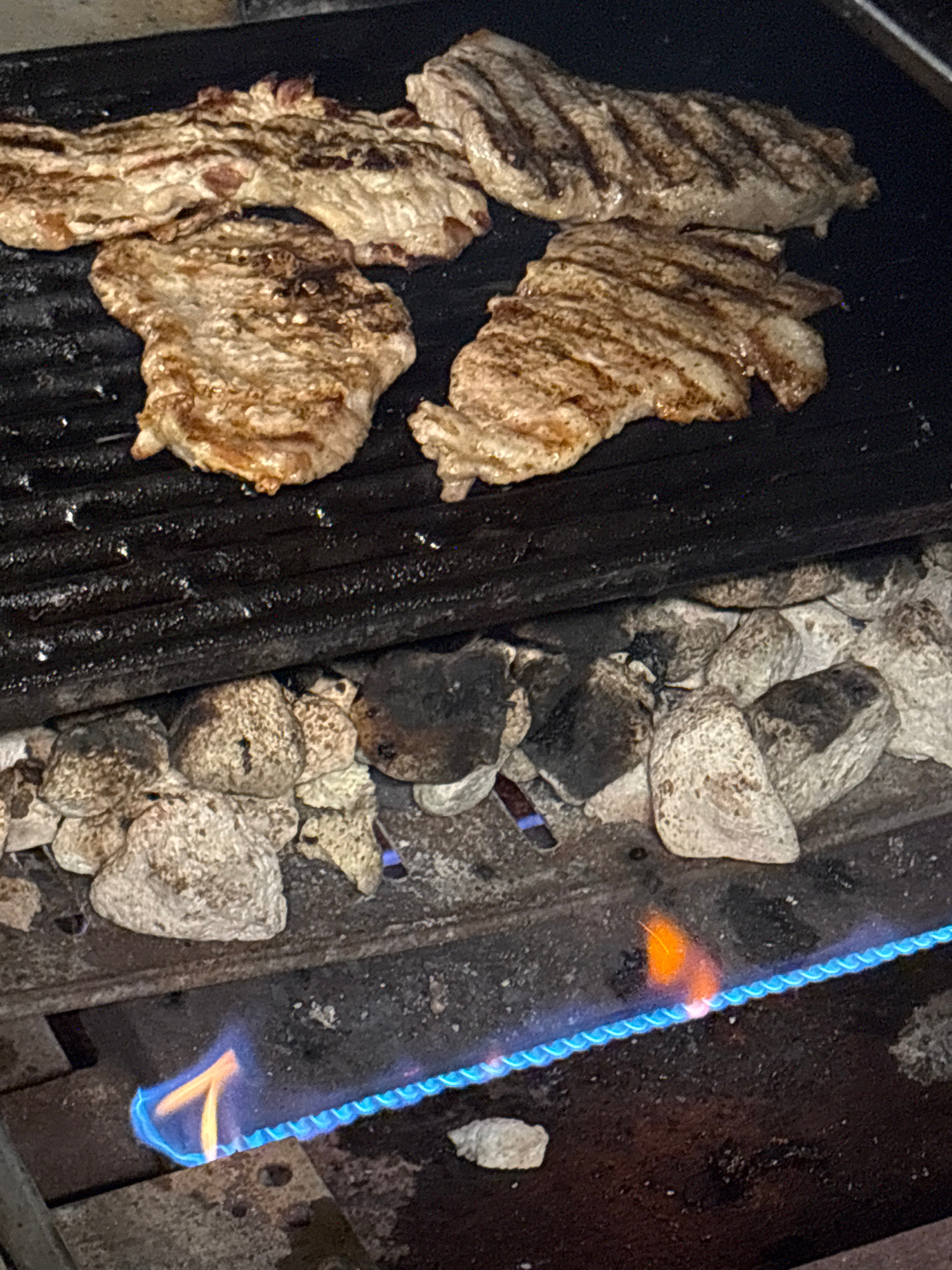 The image shows a close-up of a grill. Four pieces of meat are cooking on the grill grates. To the right of the meat are ceramic briquettes. A blue and orange flame is visible on the right side of the…read more
