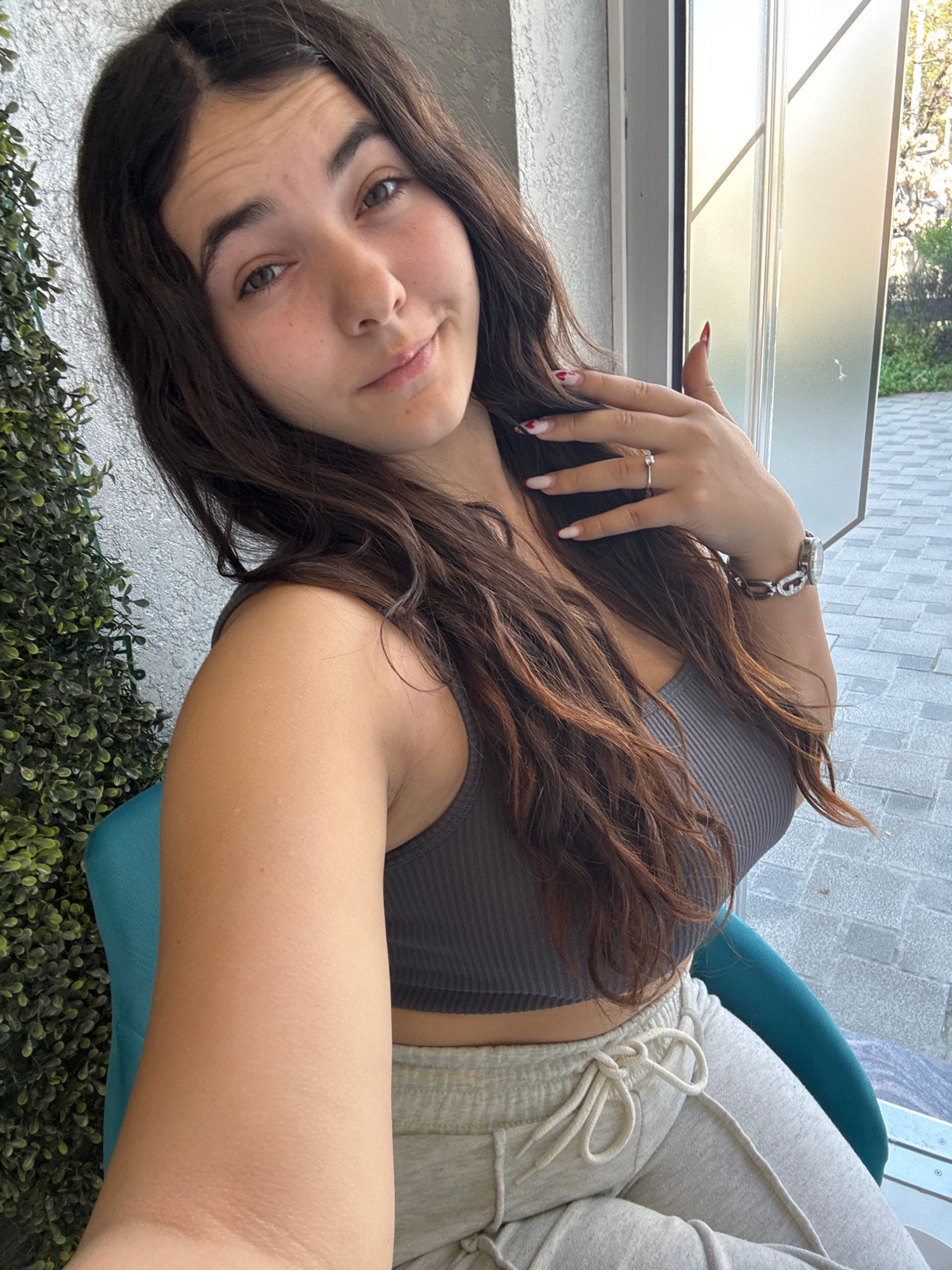 A young woman with brown hair and fair skin is positioned in the foreground, likely taking a selfie. She is wearing a grey ribbed tank top and light grey sweatpants. A silver watch adorns her left wri…read more