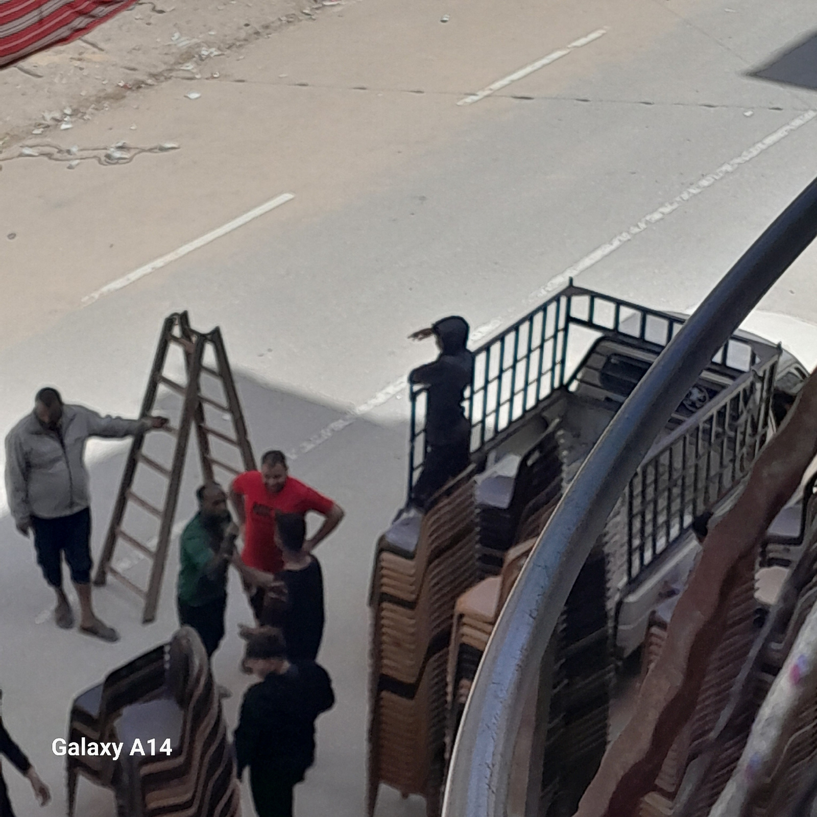 The image is a daytime photograph taken outdoors, presented rotated counter-clockwise. When viewed upright, it depicts an open, light-colored paved area, possibly a street or plaza, with white lines m…read more