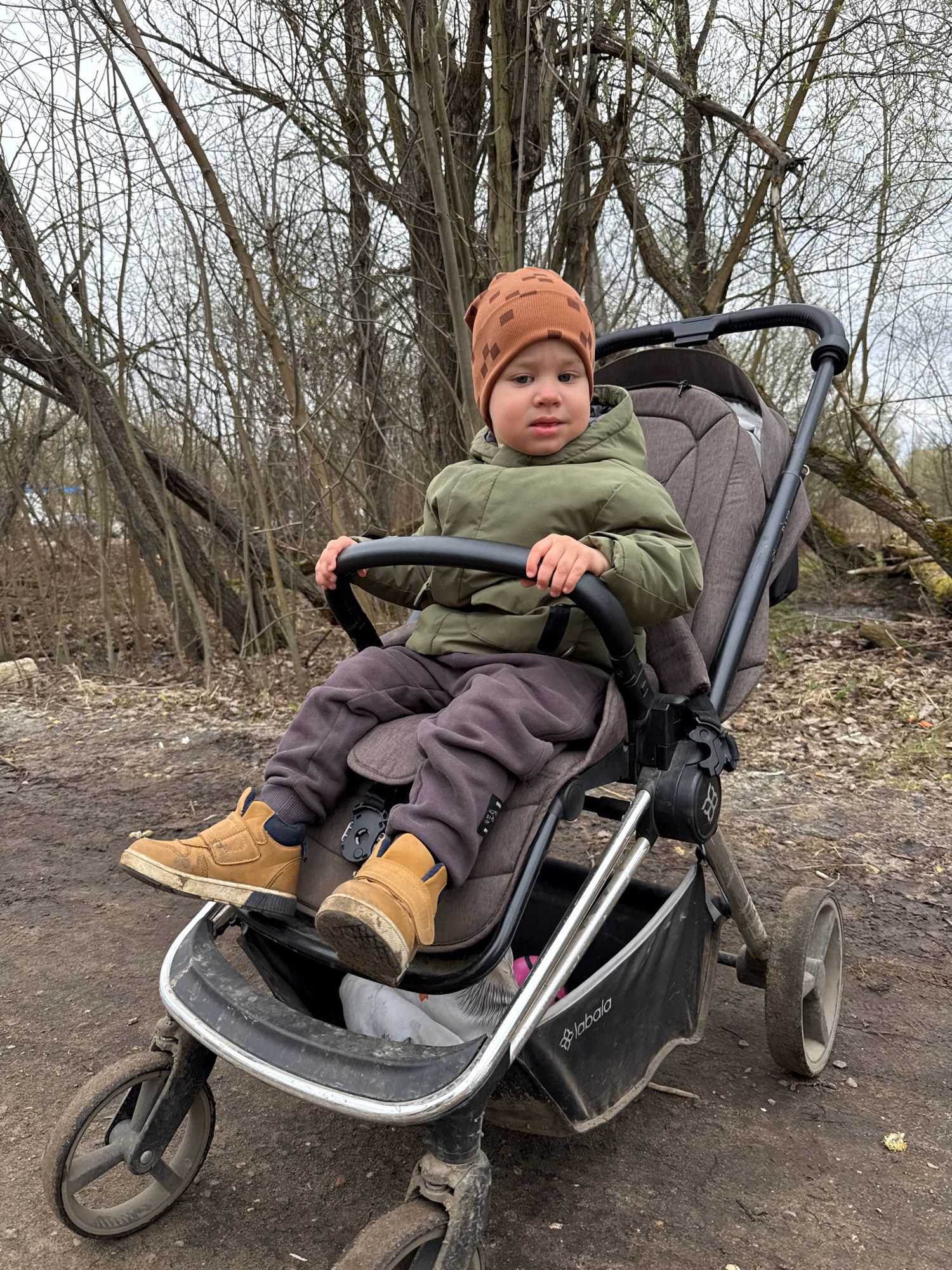 A young child wearing a brown patterned hat, a green jacket, gray sweatpants, and brown shoes is sitting in a stroller. The stroller is on a dirt path in what appears to be a wooded area with bare treβ¦read more