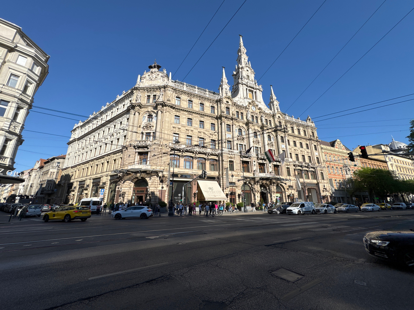 The image shows a street view in Budapest, Hungary, featuring the New York Café and the Anantara New York Palace Budapest Hotel. The architecture is ornate and historic, with multiple spires and intri…read more