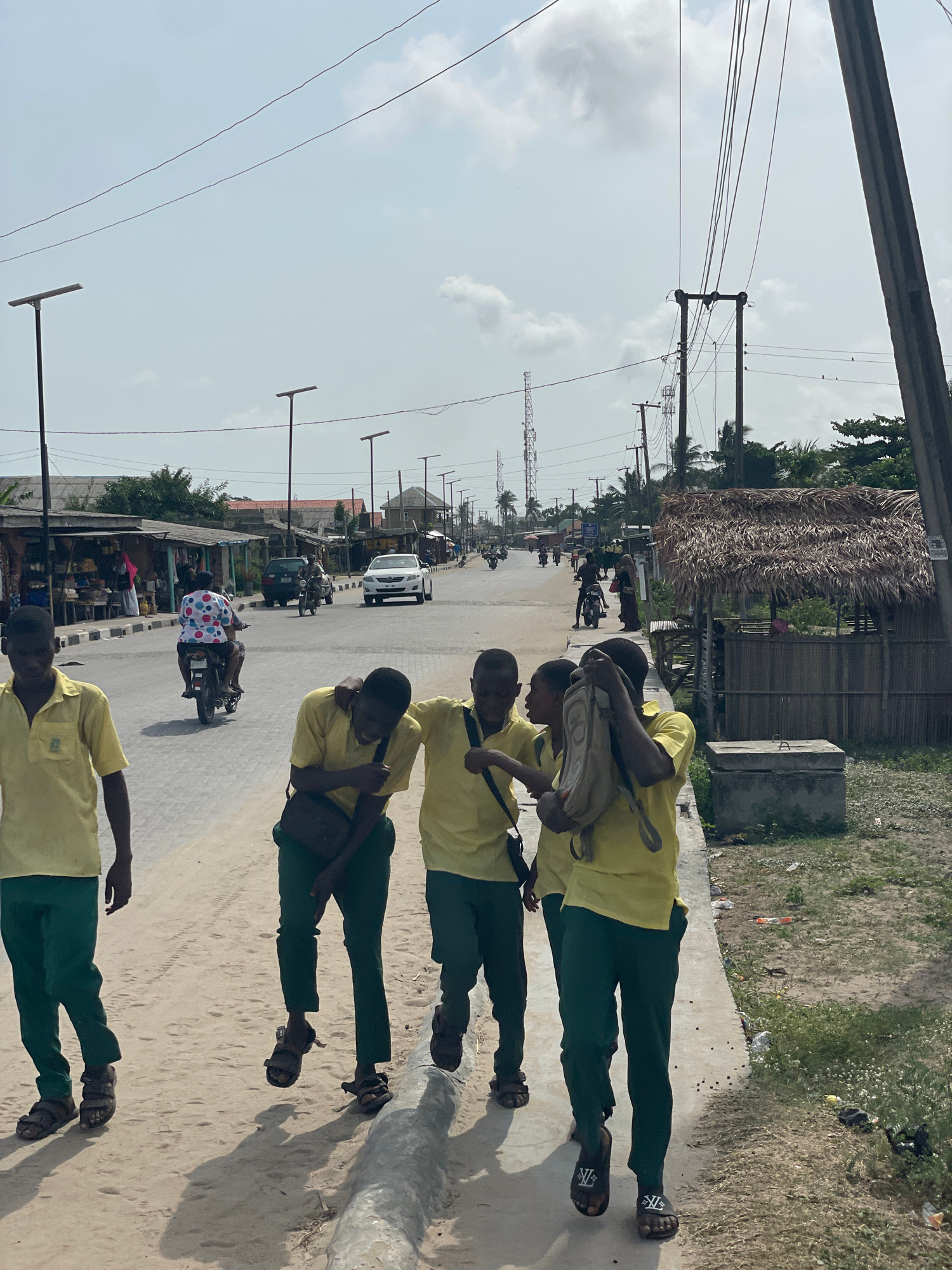 The image shows a street scene in Badagry, Nigeria. Four male figures, presumably students, are walking along a sidewalk adjacent to a road. They are wearing a uniform of green pants and light yellow…read more