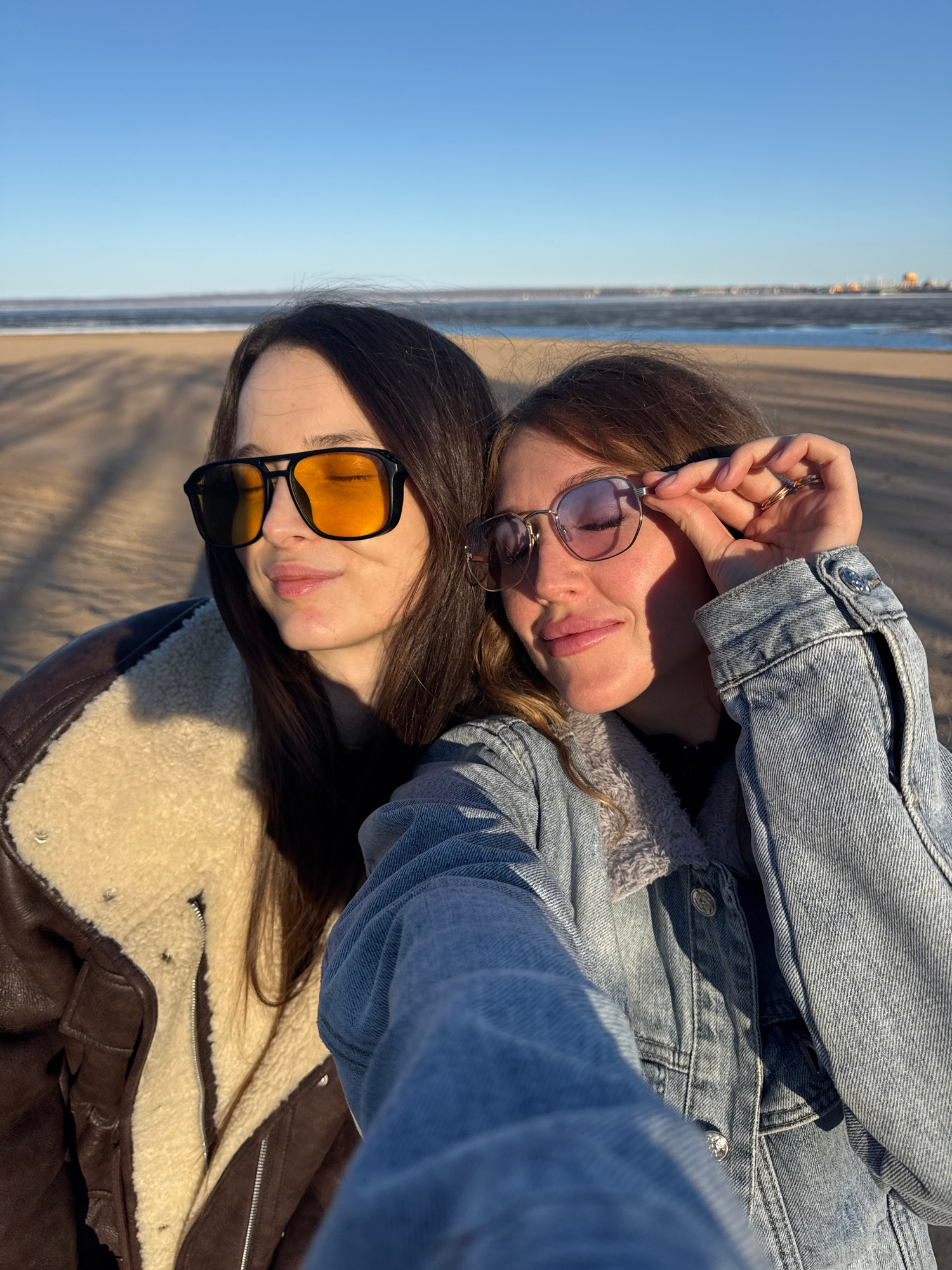 Two young women lie on a sandy beach. One woman is wearing a denim jacket, and the other is wearing a brown leather jacket with a shearling collar. Both women are wearing sunglasses. The ocean and sky…read more