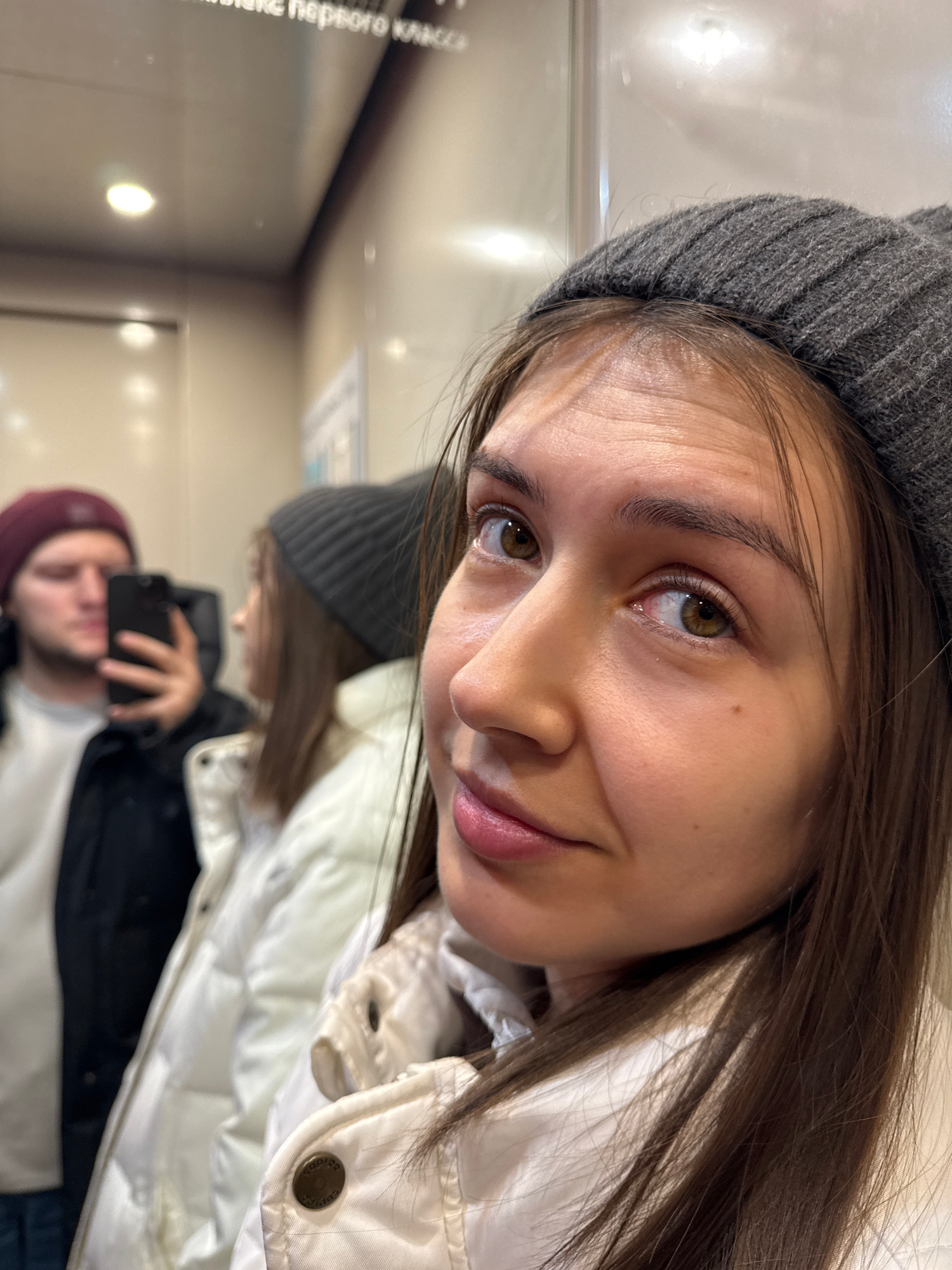 A young woman with light brown hair and brown eyes wearing a gray beanie and a white puffy jacket is taking a selfie in an elevator. The elevator's mirrored wall reflects the woman and a blurry image…read more