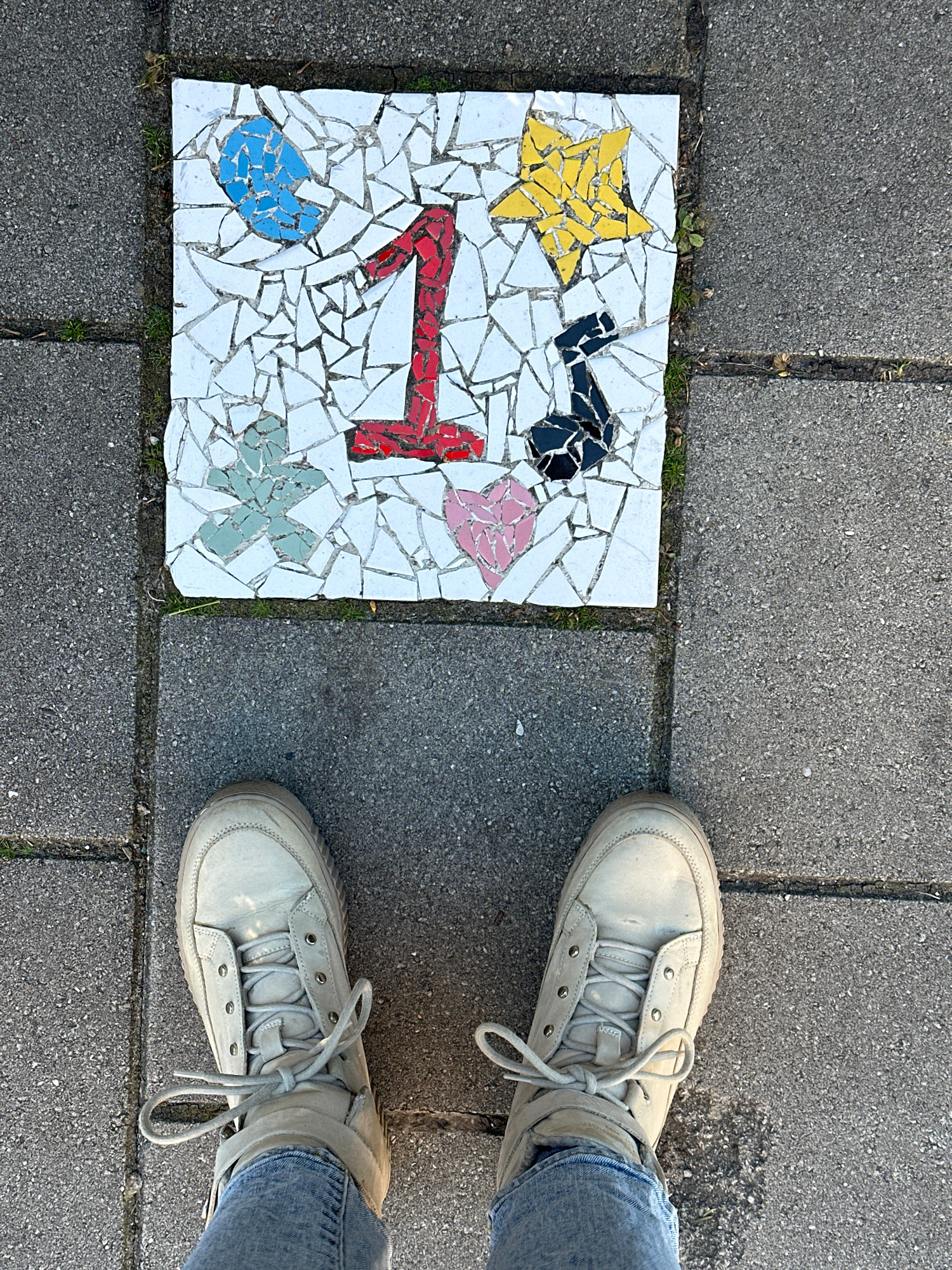A mosaic tile of broken pieces with a yellow star, black shape, pink heart, red angular figure, blue blob, and green cross is set into a gray concrete walkway, flanked by two feet in light-colored sho…read more