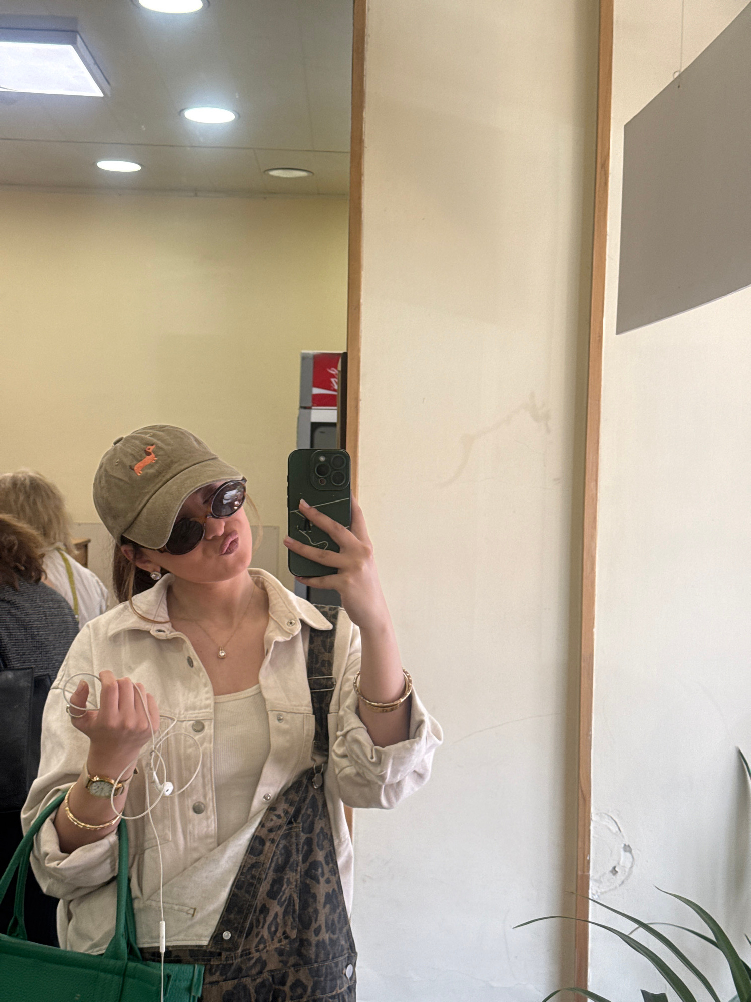A woman is taking a selfie in a mirror. She is wearing a beige baseball cap with a dog emblem, sunglasses, a beige jacket, and jewelry. She is holding a dark green cell phone in her right hand and tan…read more