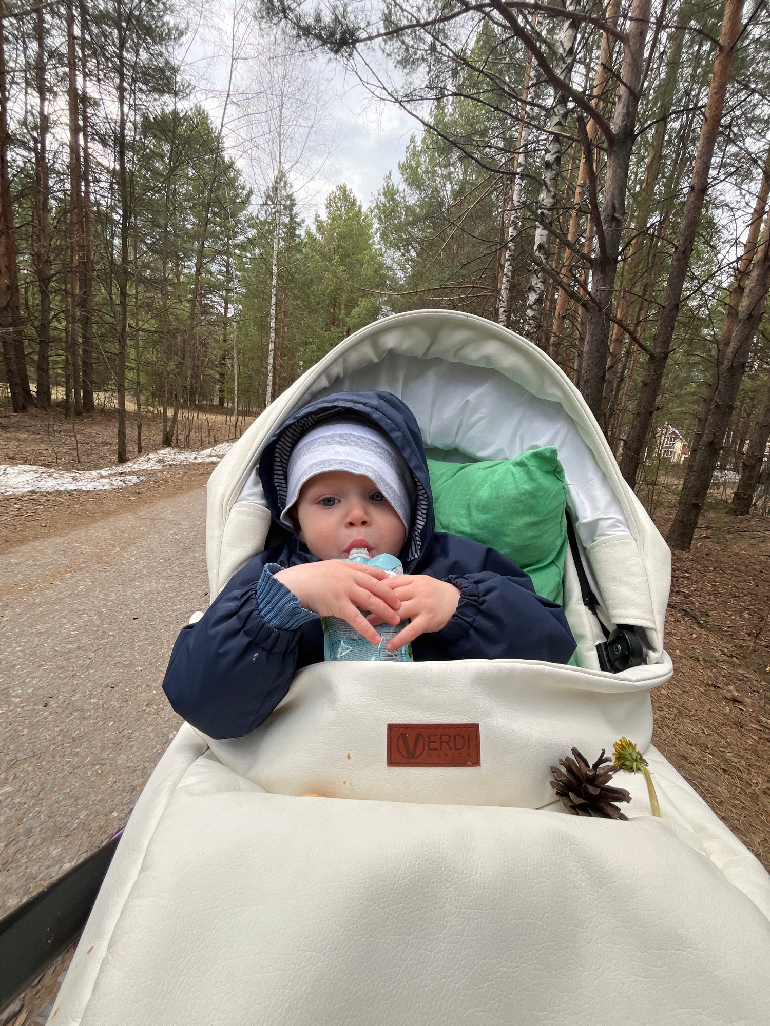 A baby is sitting in a white stroller outside, drinking from a pouch. The baby is wearing a white hat and a blue jacket. The stroller has a green pillow inside and a pinecone and a dandelion on the si…read more