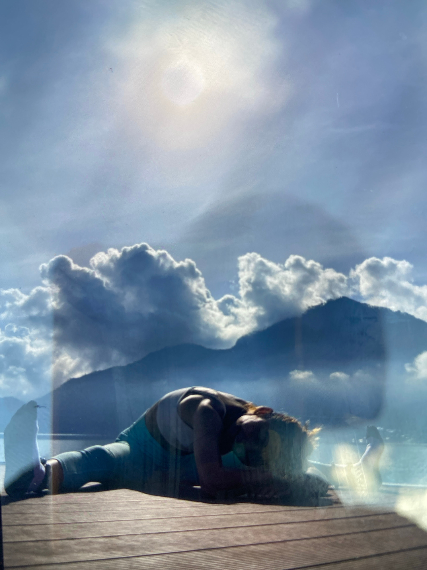A person is reflected in a glass window, with an exterior view of clouds and blue sky. The person is wearing light blue denim jeans, a light-colored top, and purple sneakers. The reflection is distort…read more