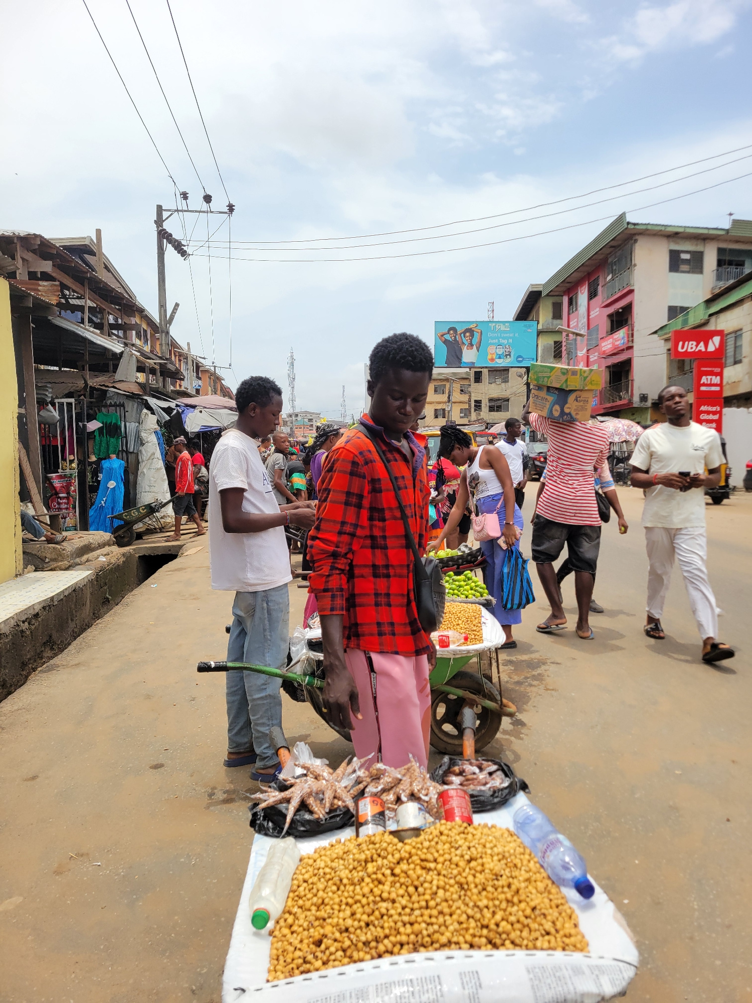 The image depicts a bustling street scene in Onitsha, Nigeria. A vendor in a red and black plaid shirt stands next to his cart, offering roasted chickpeas, dried fish and packaged snacks. The merchand…read more