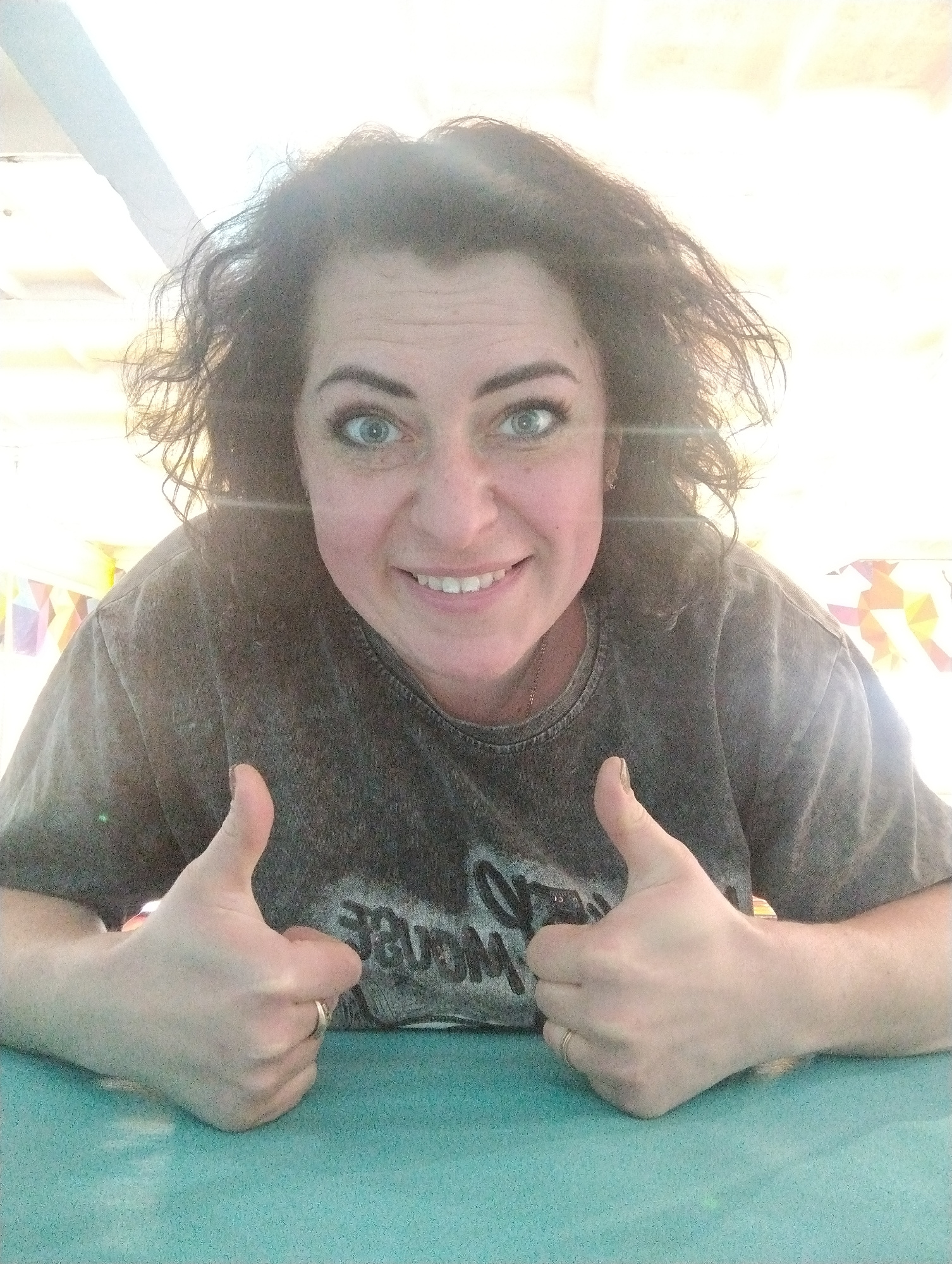 A smiling woman is centered in the frame, looking directly at the camera and giving a thumbs-up with both hands. She has curly dark hair and blue eyes. She is wearing a grey t-shirt. The background is…read more