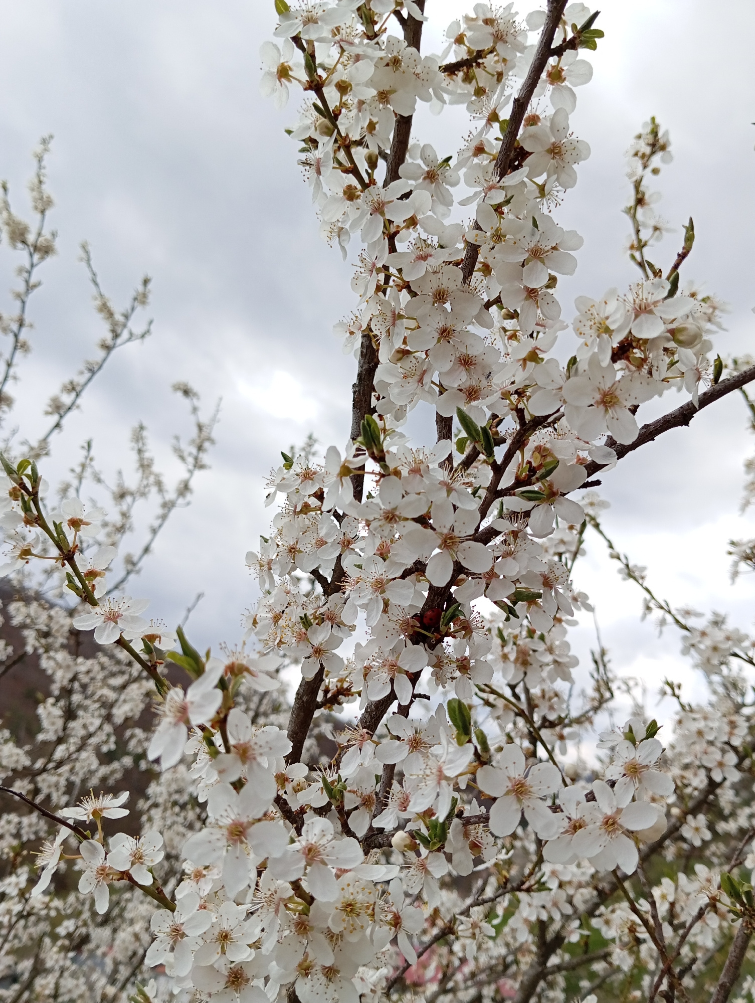 The image depicts a close-up view of flowering tree branches against a cloudy sky. The branches are laden with small, white blossoms. Some branches show tiny green leaves beginning to emerge. The over…read more